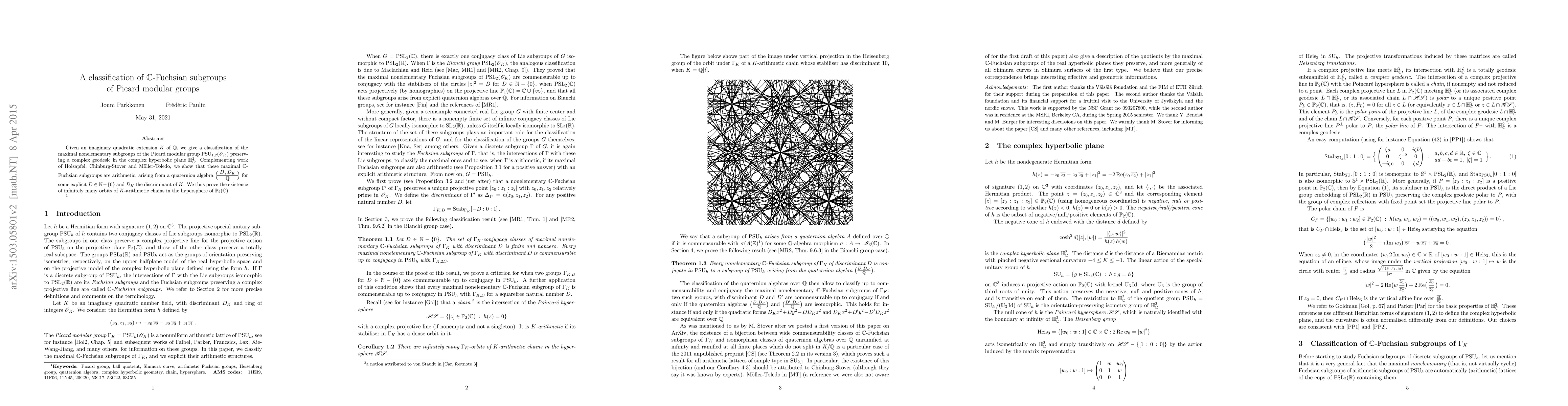Given an imaginary quadratic extension $K$ of $\mathbb Q$, we give a classification of the maximal nonelementary subgroups of the Picard modular group $\operatorname{PSU}_{1,2}(\mathcal O_K)$ preserving a complex geodesic in the complex hyperbolic plane $\mathbb H^2_\mathbb C$. Complementing work of Holzapfel, Chinburg-Stover and M\"oller-Toledo, we show that these maximal $\mathbb C$-Fuchsian subgroups are arithmetic, arising from a quaternion algebra $\Big(\!\begin{array}{c} D\,,D_K\\\hline\mathbb QQ\end{array} \!\Big)$ for some explicit $D\in\mathbb N-\{0\}$ and $D_K$ the discriminant of $K$. We thus prove the existence of infinitely many orbits of $K$-arithmetic chains in the hypersphere of $\mathbb P_2(\mathbb C)$.