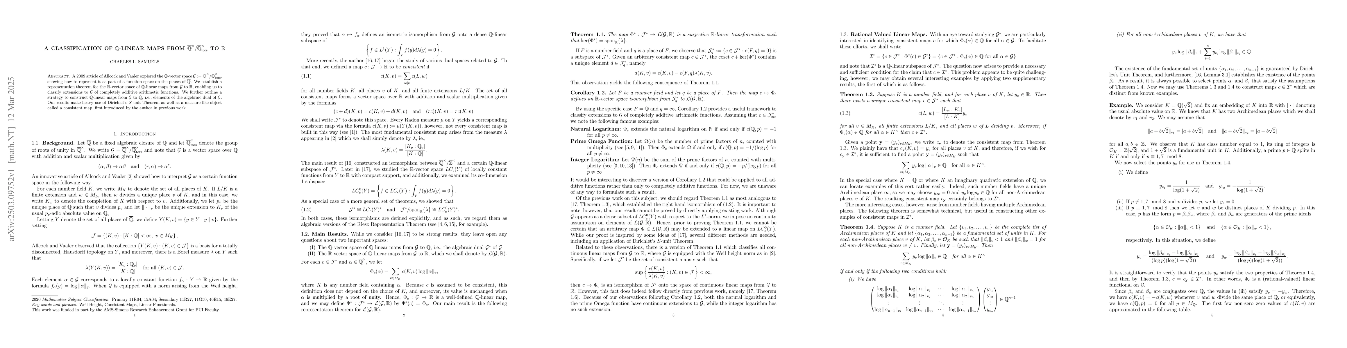 The paper establishes a representation theorem for the $\mathbb{R}$-vector space of $\mathbb{Q}$-linear maps from $\mathcal{G} = \overline{\mathbb{Q}}^\times/\overline{\mathbb{Q}}^\times_{\mathrm{tors}}$ to $\mathbb{R}$, utilizing Dirichlet's $S$-unit Theorem and consistent maps.