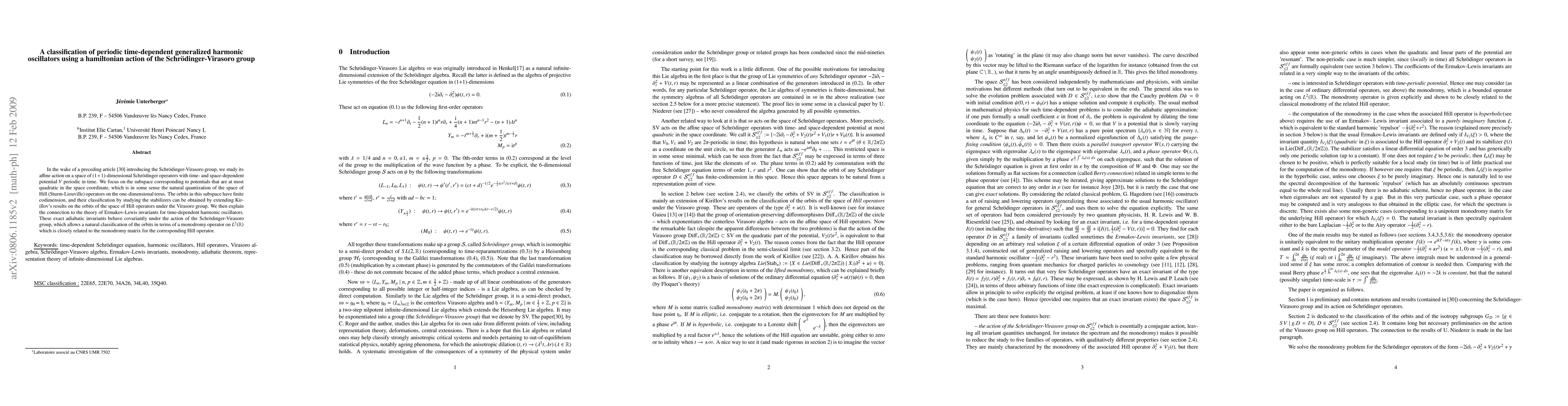 This paper classifies periodic time-dependent generalized harmonic oscillators using the Hamiltonian action of the Schrödinger-Virasoro group. It extends Kirillov's results on Hill operators' orbits under the Virasoro group to the affine action of the Schrödinger-Virasoro group, providing a natural classification based on Ermakov-Lewis invariants.