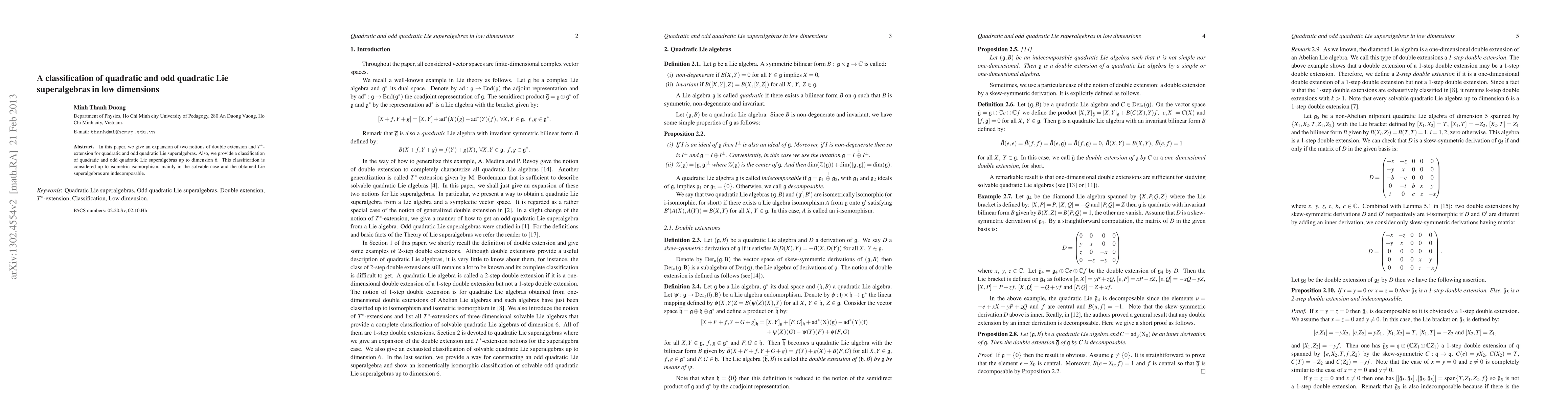 This paper expands on double extension and $T^*$-extension methods for classifying quadratic and odd quadratic Lie superalgebras, providing a detailed classification up to dimension 6, focusing on solvable, indecomposable cases.
