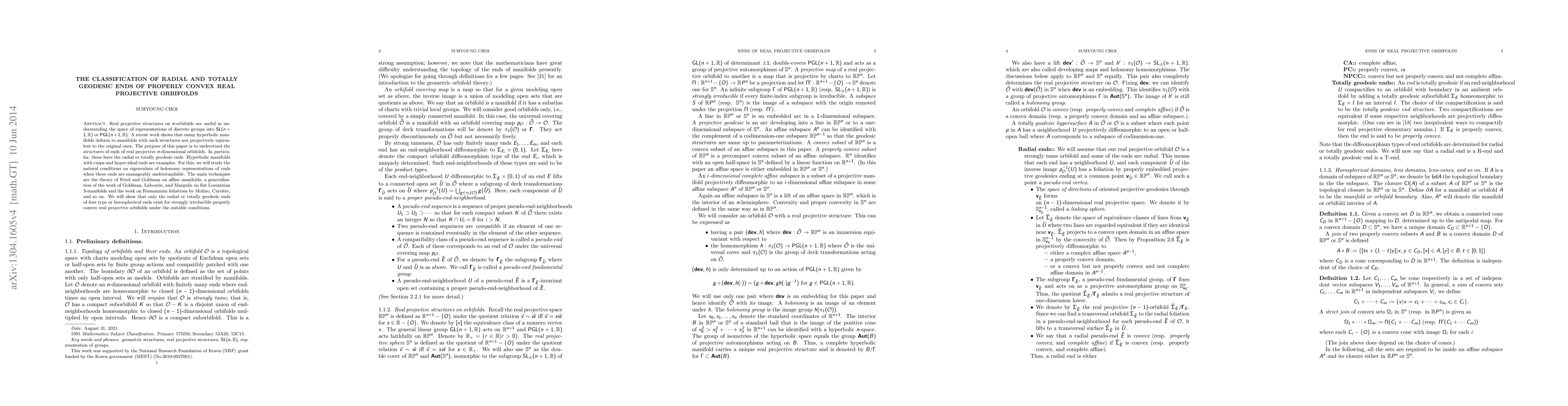 This paper classifies the radial and totally geodesic ends of properly convex real projective orbifolds, focusing on their holonomy representations and the conditions for their existence. It shows that under specific circumstances, only lens type or horospherical ends occur for strongly irreducible orbifolds, employing techniques from affine manifolds and Riemannian foliations.
