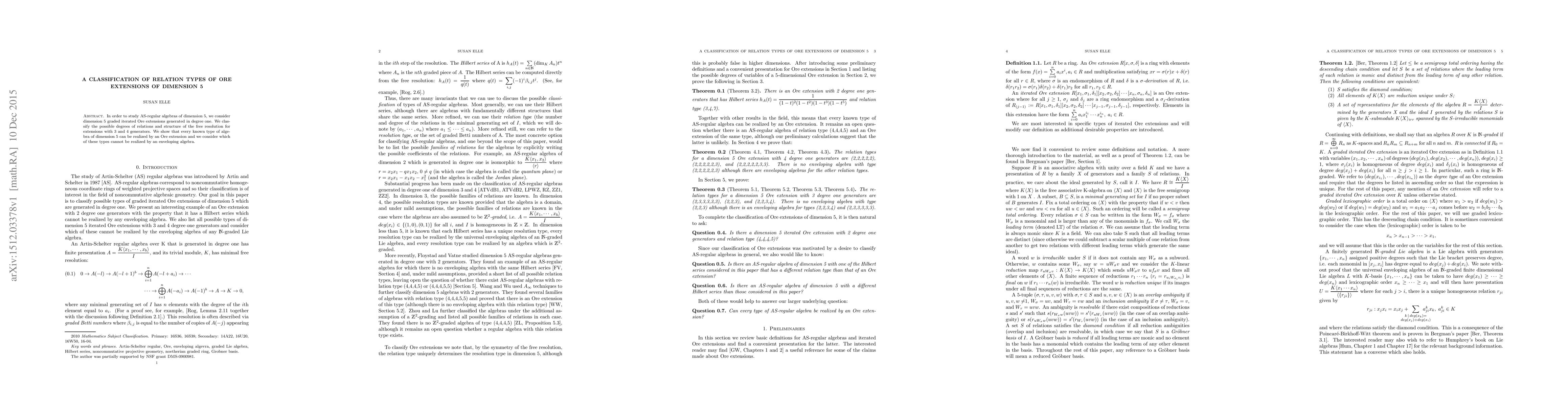 In order to study AS-regular algebras of dimension 5, we consider dimension 5 graded iterated Ore extensions generated in degree one. We classify the possible degrees of relations and structure of the free resolution for extensions with 3 and 4 generators. We show that every known type of algebra of dimension 5 can be realized by an Ore extension and we consider which of these types cannot be realized by an enveloping algebra.