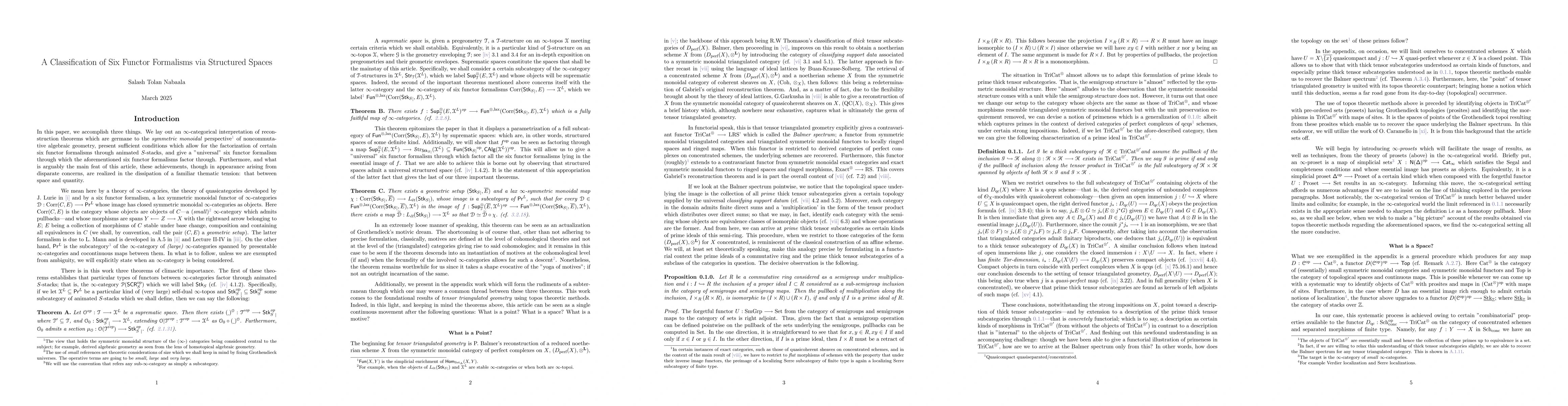 We lay out an infinity categorical interpretation of reconstruction theorems which are germane to the symmetric monoidal perspective of noncommutative algebraic geometry, present sufficient conditions which allow for the factorization of certain six functor formalisms through animated S-stacks, and give a six functor formalism through which the aforementioned six functor formalisms factor through. Furthermore, and what is arguably the main feat of this article, these achievements, though in appearance arising from disparate concerns, are realized in the dissipation of a familiar thematic tension: that between space and quantity.