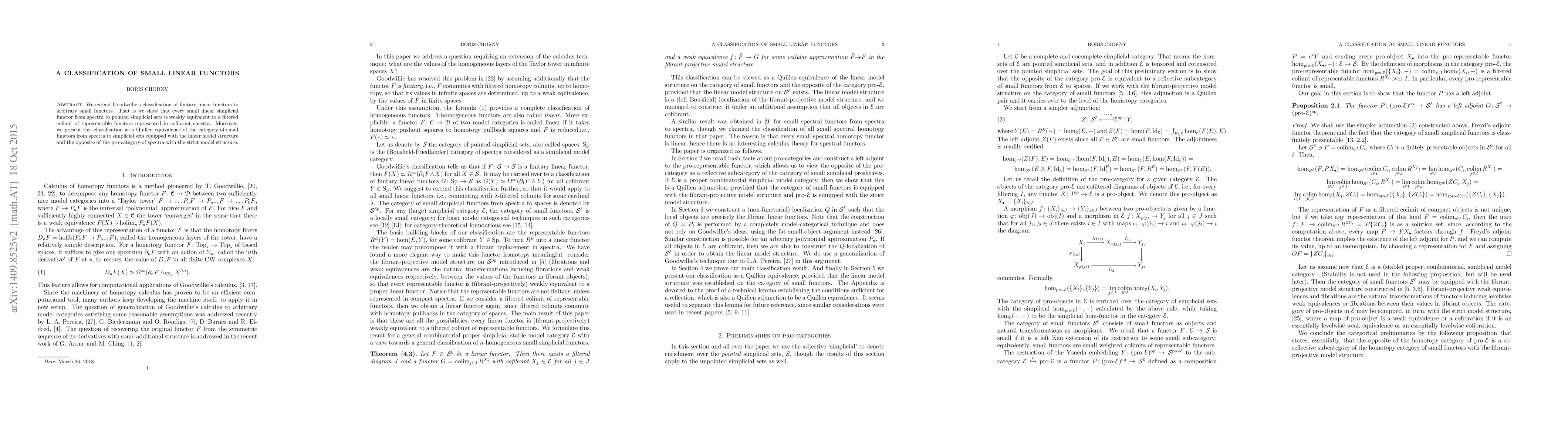 This paper extends Goodwillie's classification of finitary linear functors to small linear functors, showing they are equivalent to filtered colimits of representable functors. It establishes a Quillen equivalence between the linear model structure on small functors and the strict model structure on the pro-category of spectra.