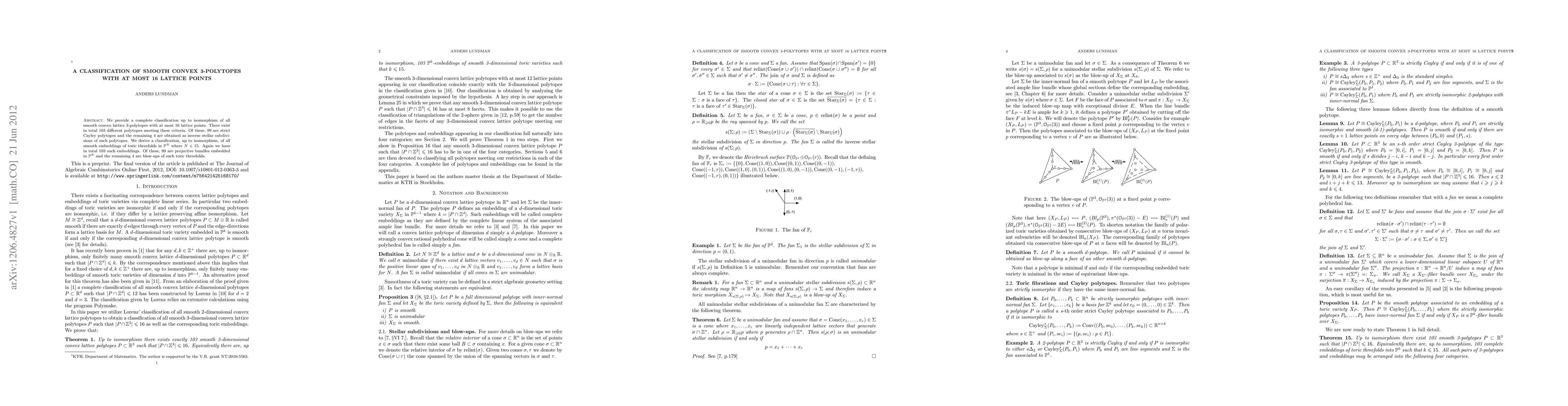 This paper classifies all smooth convex 3-polytopes with at most 16 lattice points, identifying 103 distinct polytopes, 99 of which are strict Cayley polytopes, while the remaining 4 are inverse stellar subdivisions. It also classifies smooth embeddings of toric threefolds in projective spaces, finding 103 embeddings, 99 as projective bundles and 4 as blow-ups.