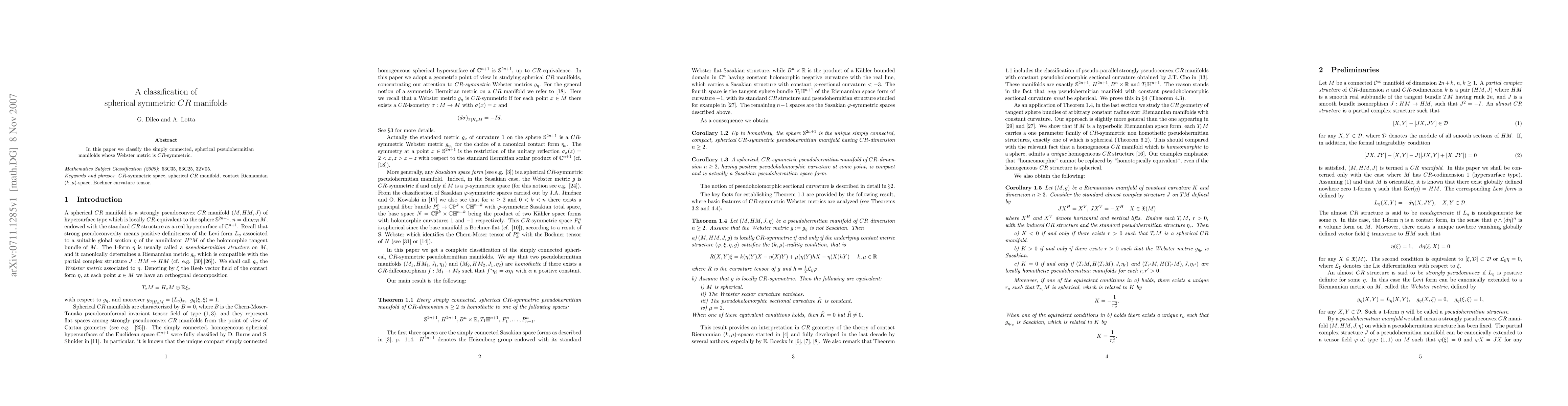 This paper classifies simply connected, spherical pseudohermitian manifolds with a CR-symmetric Webster metric, providing a comprehensive understanding of their structure and properties. The classification reveals distinct types based on their geometric and topological characteristics.