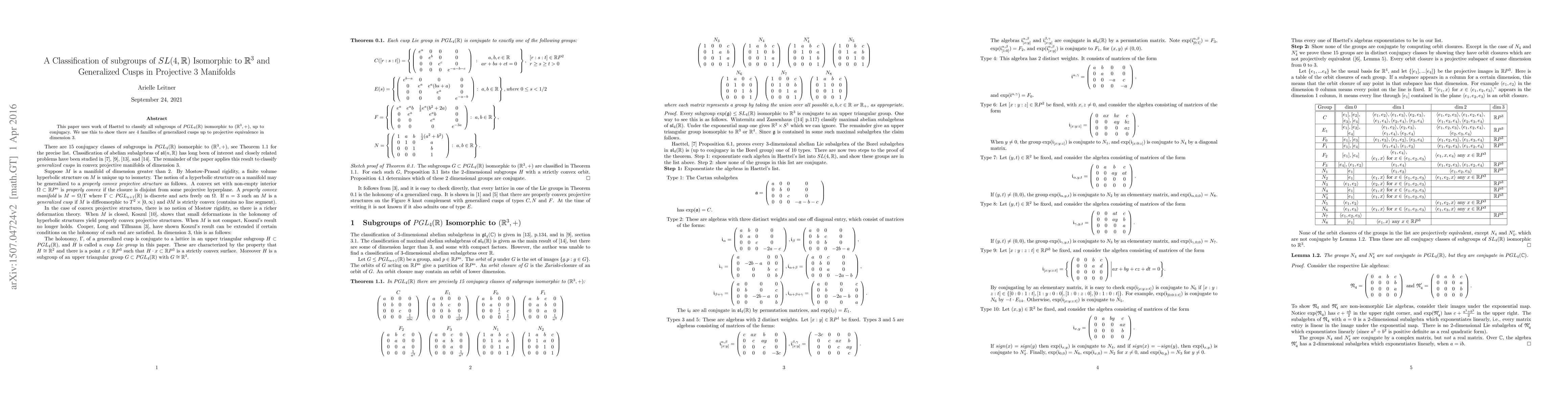 This paper uses work of Haettel to classify all subgroups of PGL(4,R) isomorphic to (R^3 , +), up to conjugacy. We use this to show there are 4 families of generalized cusps up to projective equivalence in dimension 3.