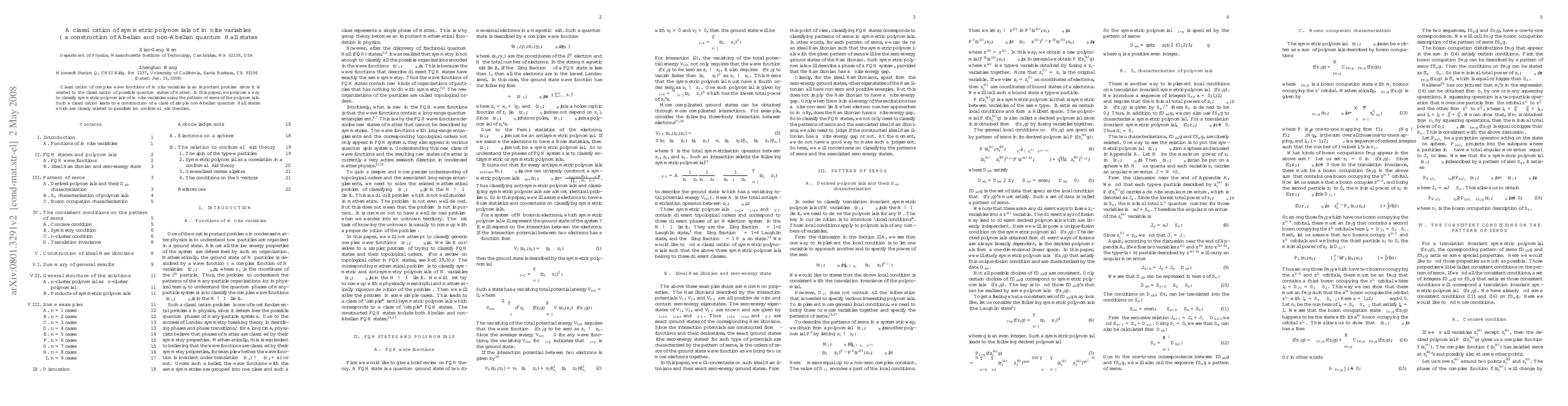 This paper introduces a method for classifying symmetric polynomials of infinite variables based on the pattern of their zeros, leading to the construction of non-Abelian quantum Hall states linked to parafermion conformal field theories. The classification is significant for understanding possible quantum states of matter.
