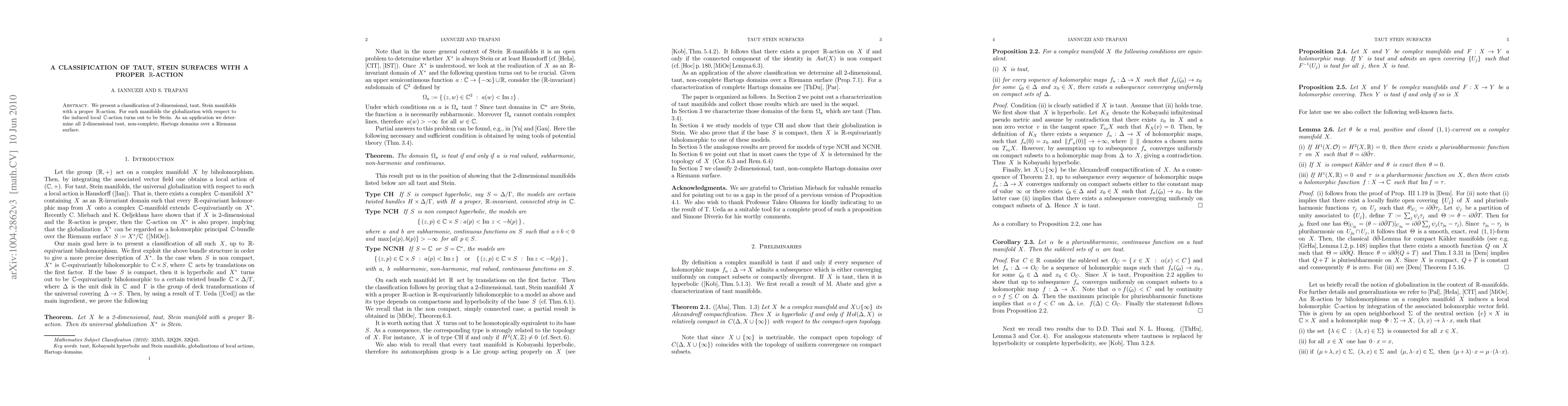 Researchers classify 2D taut Stein surfaces with a proper R-action, showing globalization preserves Stein property, and apply to find all 2D taut non-complete Hartogs domains over Riemann surfaces.