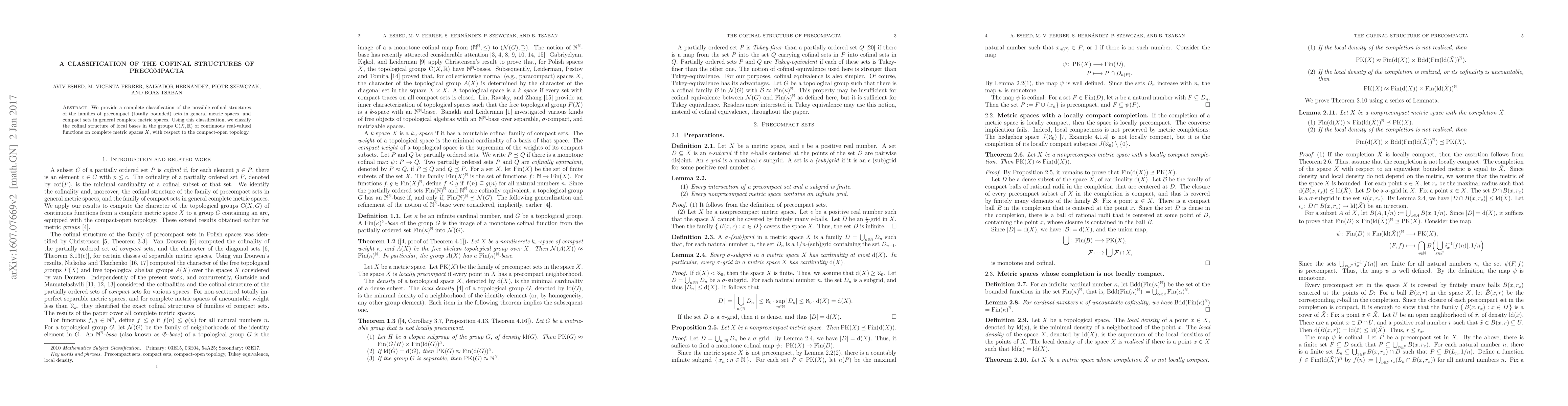 We provide a complete classification of the possible cofinal structures of the families of precompact (totally bounded) sets in general metric spaces, and compact sets in general complete metric spaces. Using this classification, we classify the cofinal structure of local bases in the groups $\C(X,\bbR)$ of continuous real-valued functions on complete metric spaces $X$, with respect to the compact-open topology.