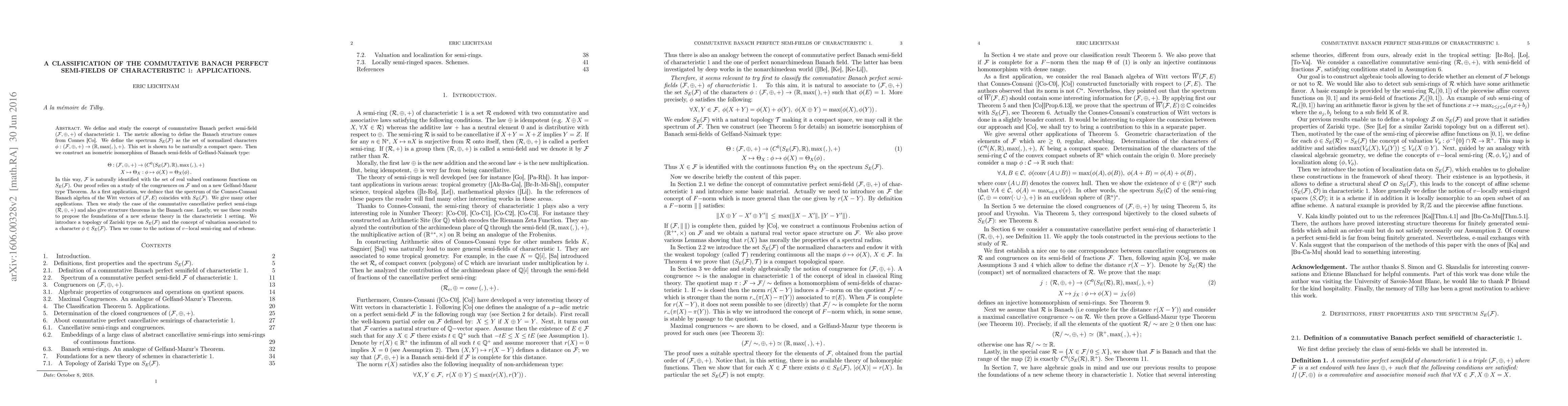 We define and study the concept of commutative Banach perfect semi-field of characteristic 1 by using results from Connes-Consani. We prove a Gelfand-Naimark type theorem allowing to identify such a Banach semi-field F to the semi-field of all the continuous functions on a compact space which we define as the spectrum of F. We give many applications.