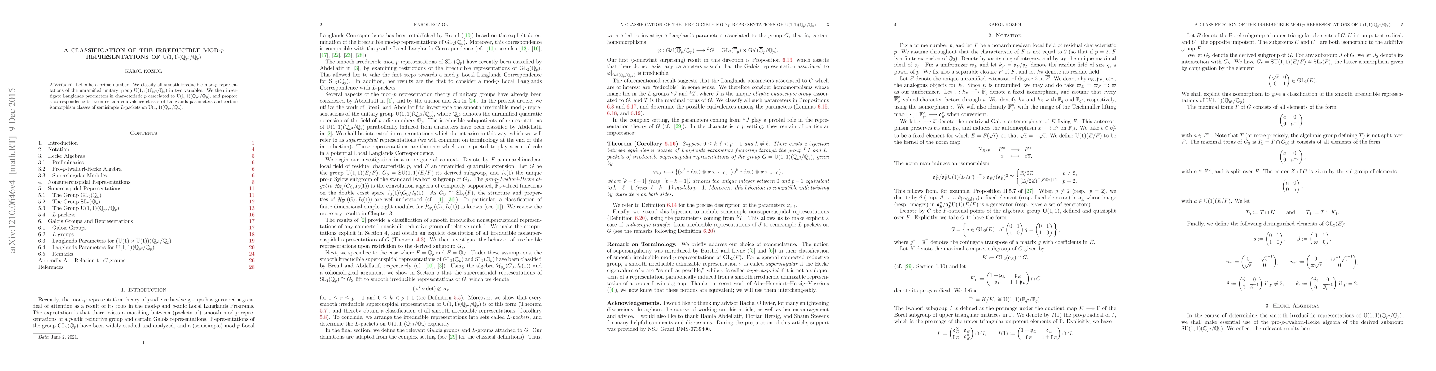 This paper classifies all smooth irreducible mod-p representations of the unramified unitary group U(1,1)(Q_p^2/Q_p) and explores Langlands parameters in characteristic p, proposing a correspondence between certain Langlands parameters and semisimple L-packets.