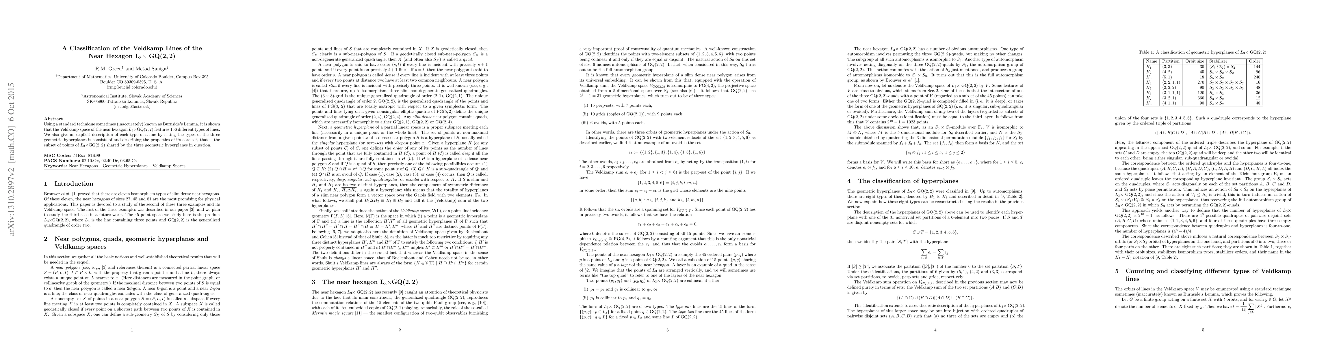 This paper classifies the 156 different types of Veldkamp lines in the near hexagon L_3 times GQ(2, 2), employing a technique akin to Burnside's Lemma. Each line type is explicitly described by its constituent geometric hyperplanes and the properties of its core set.