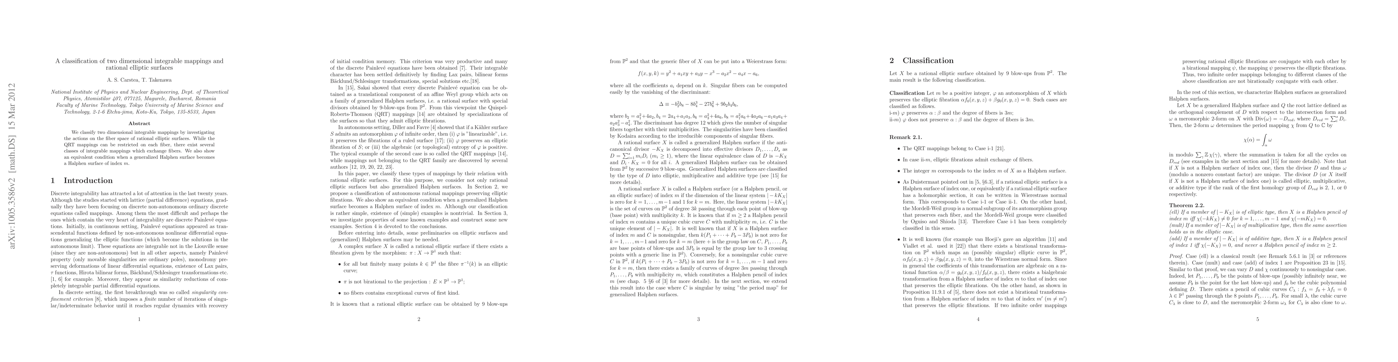 Summary: This paper classifies two-dimensional integrable mappings by examining their actions on rational elliptic surfaces, identifying classes that exchange fibers and providing conditions for generalized Halphen surfaces to become standard Halphen surfaces of index m.
