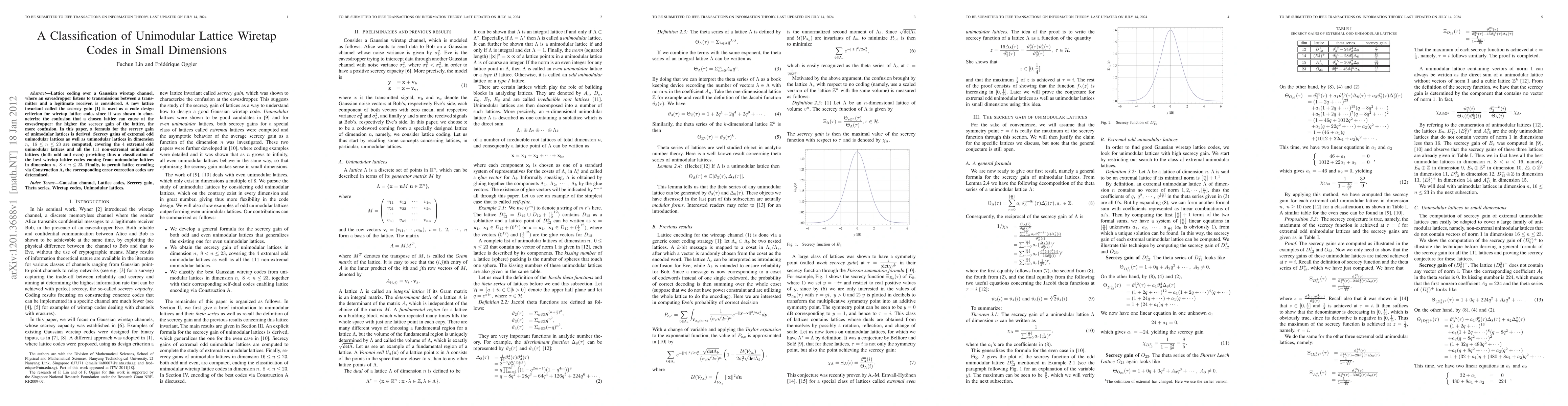 This paper classifies unimodular lattice wiretap codes in dimensions 8 to 23, deriving a formula for the secrecy gain and computing it for extremal and nonextremal lattices. It identifies the best lattice codes for these dimensions and determines corresponding error correction codes for lattice encoding.