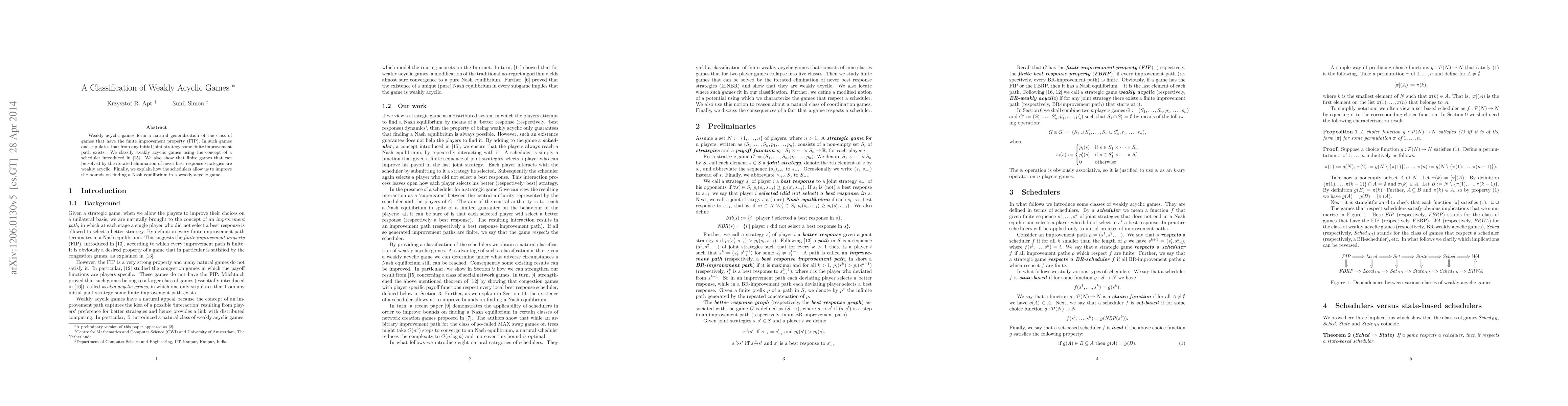 The paper classifies weakly acyclic games using the concept of a scheduler, demonstrating that finite games solvable by iterated elimination of never best response strategies are weakly acyclic, and showing how schedulers improve bounds on finding a Nash equilibrium.