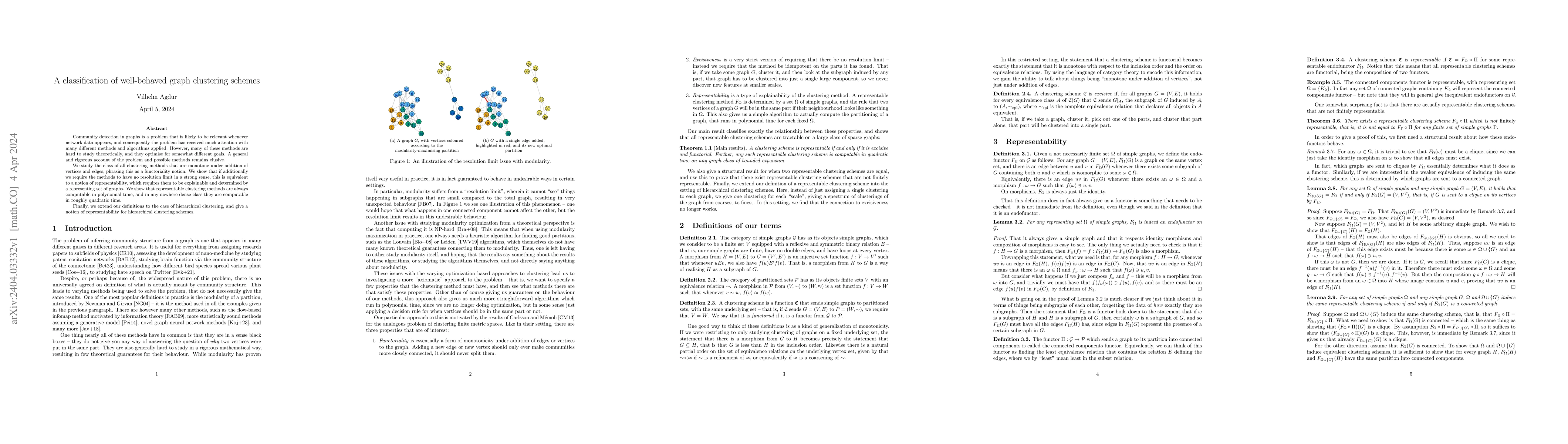 This paper classifies well-behaved graph clustering schemes by focusing on those that are monotone and have no resolution limits. It demonstrates that such schemes are representable and computable in polynomial time, with specific efficiencies noted for nowhere dense classes. The study extends these principles to hierarchical clustering.