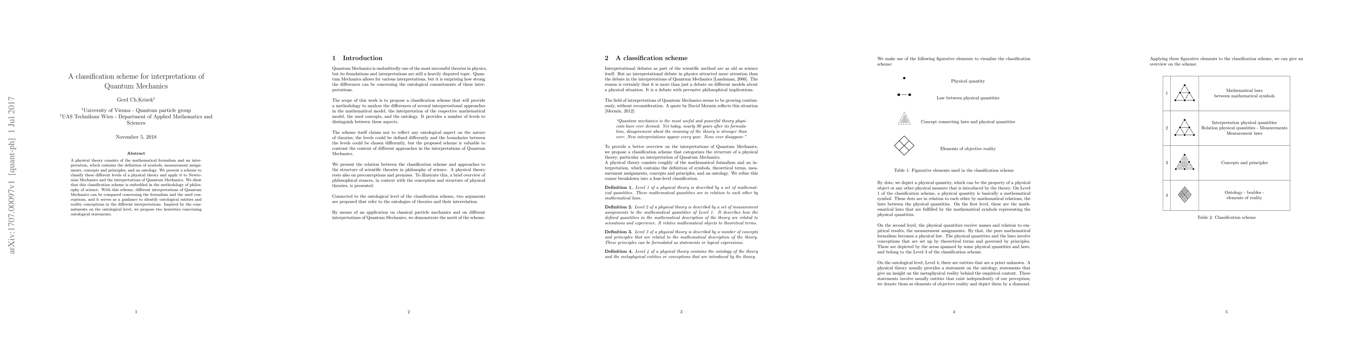 A physical theory consists of the mathematical formalism and an interpretation, which contains the definition of symbols, measurement assignments, concepts and principles, and an ontology. We present a scheme to classify these different levels of a physical theory and apply it to Newtonian Mechanics and the interpretations of Quantum Mechanics. We show that this classification scheme is embedded in the methodology of philosophy of science. With this scheme, different interpretations of Quantum Mechanics can be compared concerning the formalism and the used conceptions, and it serves as a guidance to identify ontological entities and reality conceptions in the different interpretations. Inspired by the commitments on the ontological level, we propose two heuristics concerning ontological statements.