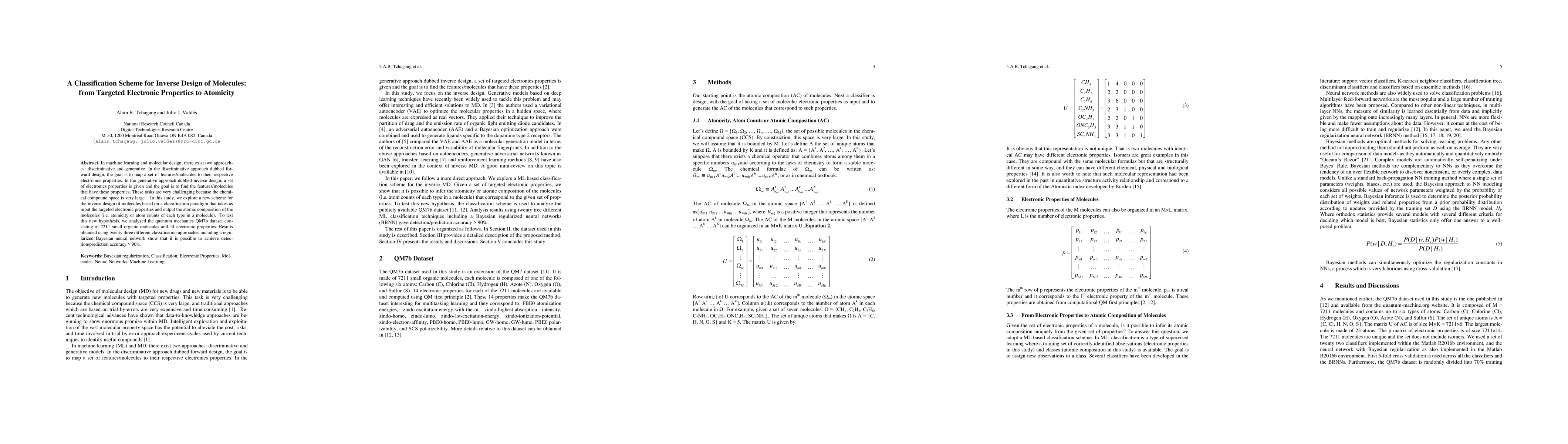 In machine learning and molecular design, there exist two approaches: discriminative and generative. In the discriminative approach dubbed forward design, the goal is to map a set of features/molecules to their respective electronics properties. In the generative approach dubbed inverse design, a set of electronics properties is given and the goal is to find the features/molecules that have these properties. These tasks are very challenging because the chemical compound space is very large. In this study, we explore a new scheme for the inverse design of molecules based on a classification paradigm that takes as input the targeted electronic properties and output the atomic composition of the molecules (i.e. atomicity or atom counts of each type in a molecule). To test this new hypothesis, we analyzed the quantum mechanics QM7b dataset consisting of 7211 small organic molecules and 14 electronic properties. Results obtained using twenty three different classification approaches including a regularized Bayesian neural network show that it is possible to achieve detection/prediction accuracy > 90%.