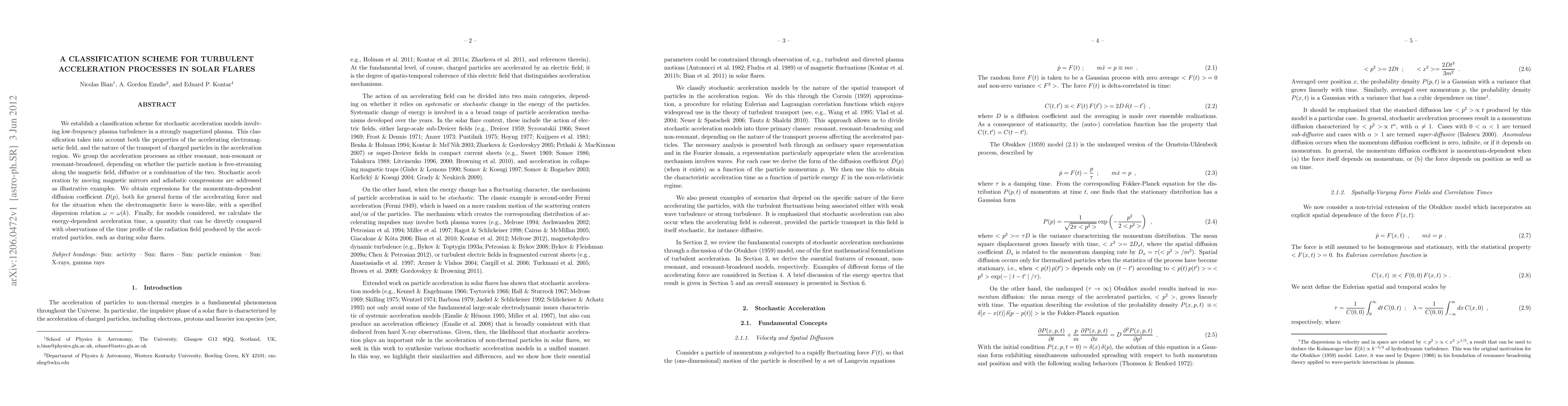 We establish a classification scheme for stochastic acceleration models involving low-frequency plasma turbulence in a strongly magnetized plasma. This classification takes into account both the properties of the accelerating electromagnetic field, and the nature of the transport of charged particles in the acceleration region. We group the acceleration processes as either resonant, non-resonant or resonant-broadened, depending on whether the particle motion is free-streaming along the magnetic field, diffusive or a combination of the two. Stochastic acceleration by moving magnetic mirrors and adiabatic compressions are addressed as illustrative examples. We obtain expressions for the momentum-dependent diffusion coefficient $D(p)$, both for general forms of the accelerating force and for the situation when the electromagnetic force is wave-like, with a specified dispersion relation $\omega=\omega(k)$. Finally, for models considered, we calculate the energy-dependent acceleration time, a quantity that can be directly compared with observations of the time profile of the radiation field produced by the accelerated particles, such as during solar flares.