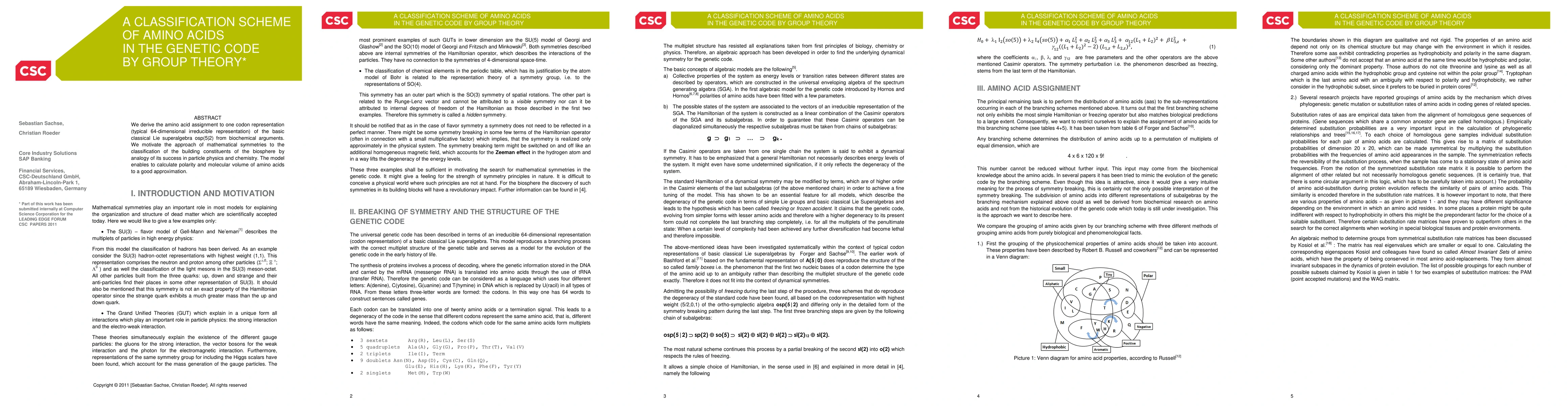 We derive the amino acid assignment to one codon representation (typical 64-dimensional irreducible representation) of the basic classical Lie superalgebra osp(5|2) from biochemical arguments. We motivate the approach of mathematical symmetries to the classification of the building constituents of the biosphere by analogy of its success in particle physics and chemistry. The model enables to calculate polarity and molecular volume of amino acids to a good approximation.