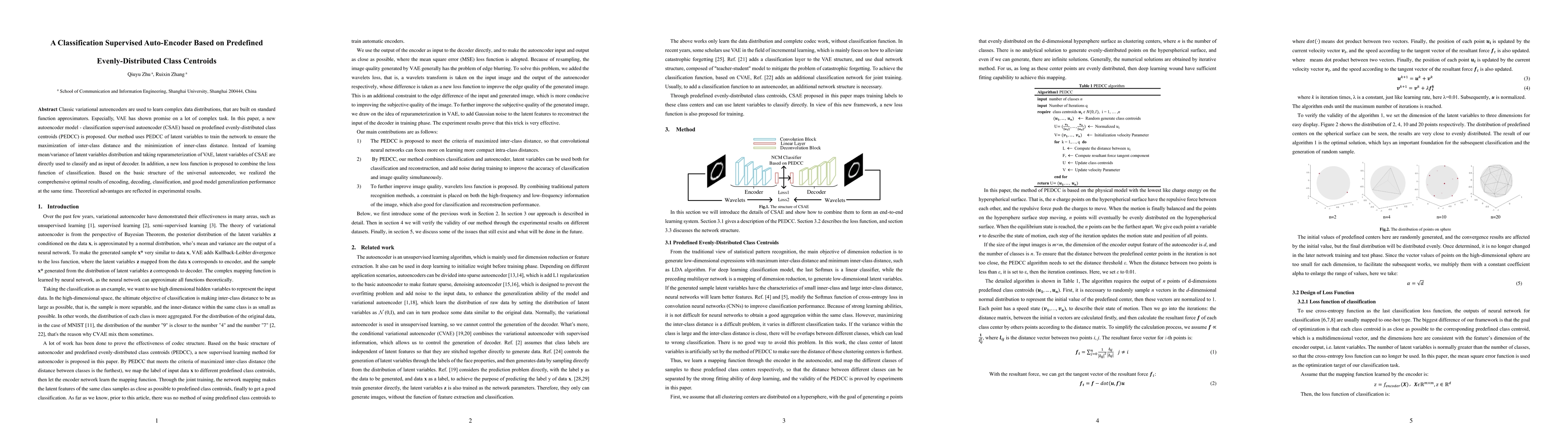 This paper proposes a new classification supervised autoencoder (CSAE) based on predefined evenly-distributed class centroids (PEDCC) to improve data classification. The model uses PEDCC to maximize inter-class distance and minimize inner-class distance, achieving optimal results in encoding, decoding, classification, and generalization.