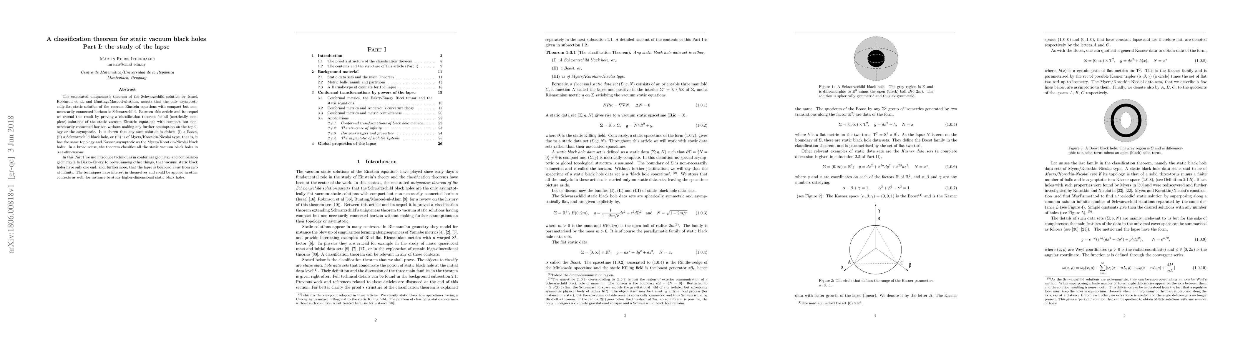 The celebrated uniqueness's theorem of the Schwarzschild solution by Israel, Robinson et al, and Bunting/Masood-ul-Alam, asserts that the only asymptotically flat static solution of the vacuum Einstein equations with compact but non-necessarily connected horizon is Schwarzschild. Between this article and its sequel we extend this result by proving a classification theorem for all (metrically complete) solutions of the static vacuum Einstein equations with compact but non-necessarily connected horizon without making any further assumption on the topology or the asymptotic. It is shown that any such solution is either: (i) a Boost, (ii) a Schwarzschild black hole, or (iii) is of Myers/Korotkin-Nicolai type, that is, it has the same topology and Kasner asymptotic as the Myers/Korotkin-Nicolai black holes. In a broad sense, the theorem classifies all the static vacuum black holes in 3+1-dimensions. In this Part I we use introduce techniques in conformal geometry and comparison geometry \'a la Bakry-\'Emery to prove that vacuum static black holes have only one end, and, furthermore, that the lapse is bounded away from zero at infinity. The techniques have interest in themselves and could be applied in other contexts as well, for instance to study higher-dimensional static black holes.