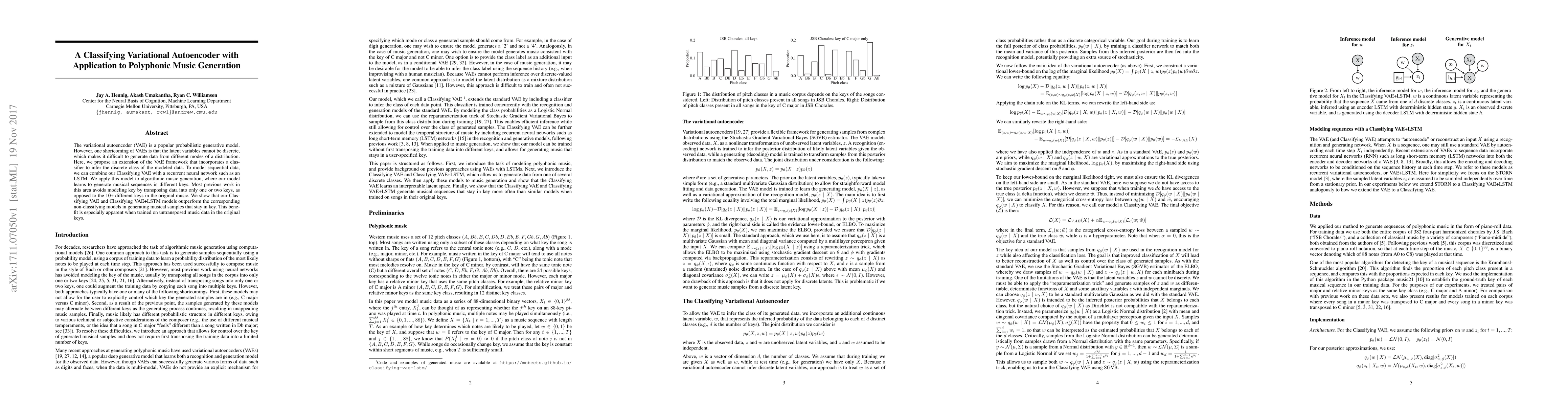 This paper proposes a Classifying Variational Autoencoder (CVAE) that integrates a classifier to handle discrete latent variables, enabling it to generate data from different modes of a distribution. The CVAE is applied to polyphonic music generation, outperforming traditional VAE models by generating musical sequences that stay in key, especially when trained on untransposed music data.