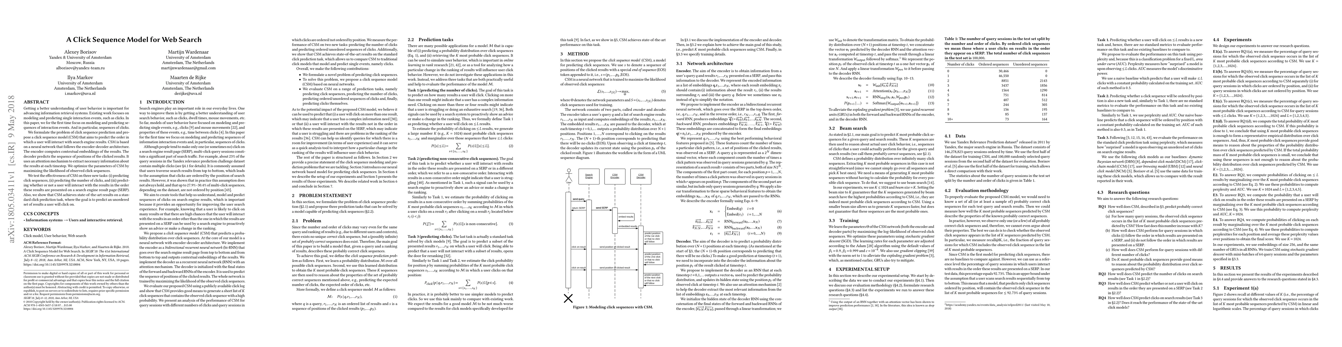 This paper introduces a novel click sequence model (CSM) based on a neural network to predict the order of user interactions with search engine results, employing an encoder-decoder architecture with an attention mechanism. CSM achieves state-of-the-art results on tasks including predicting click sequences, the number of clicks, and user interaction order on SERPs.