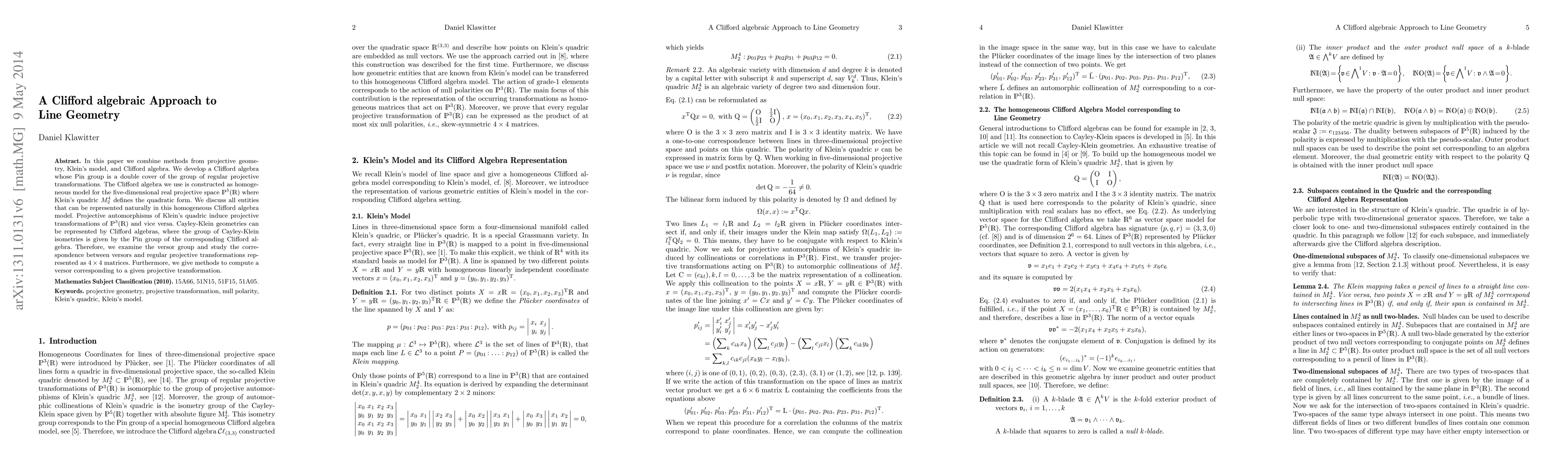 This paper integrates projective geometry, Klein's model, and Clifford algebra to develop a Clifford algebra that serves as a homogeneous model for $P^5(\mathbb{R})$. It explores the correspondence between projective transformations and the Pin group, providing methods to compute versors from projective transformations.