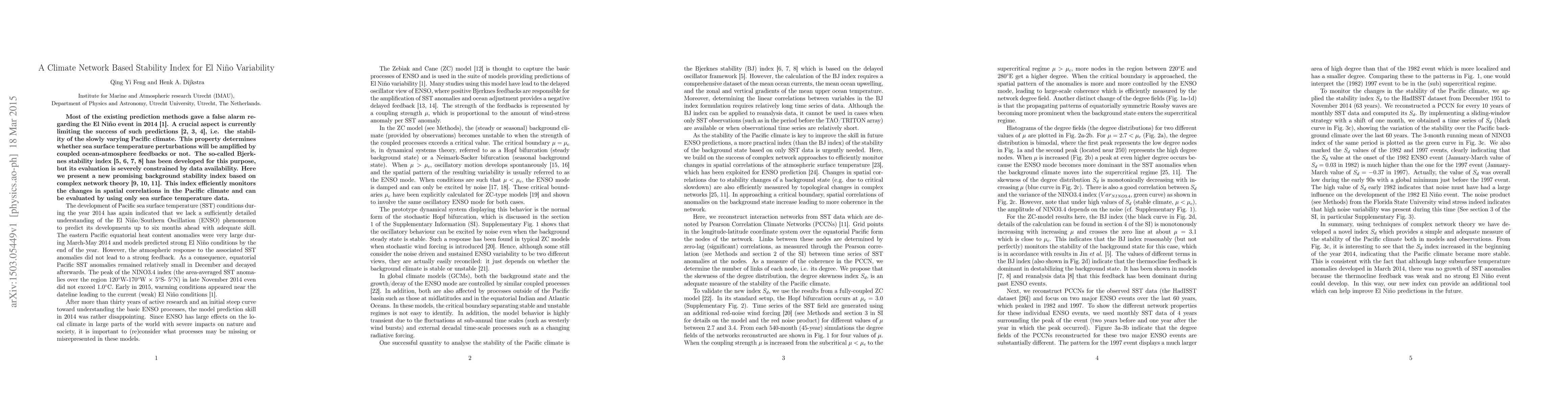 Most of the existing prediction methods gave a false alarm regarding the El Ni\~no event in 2014. A crucial aspect is currently limiting the success of such predictions, i.e. the stability of the slowly varying Pacific climate. This property determines whether sea surface temperature perturbations will be amplified by coupled ocean-atmosphere feedbacks or not. The so-called Bjerknes stability index has been developed for this purpose, but its evaluation is severely constrained by data availability. Here we present a new promising background stability index based on complex network theory. This index efficiently monitors the changes in spatial correlations in the Pacific climate and can be evaluated by using only sea surface temperature data.