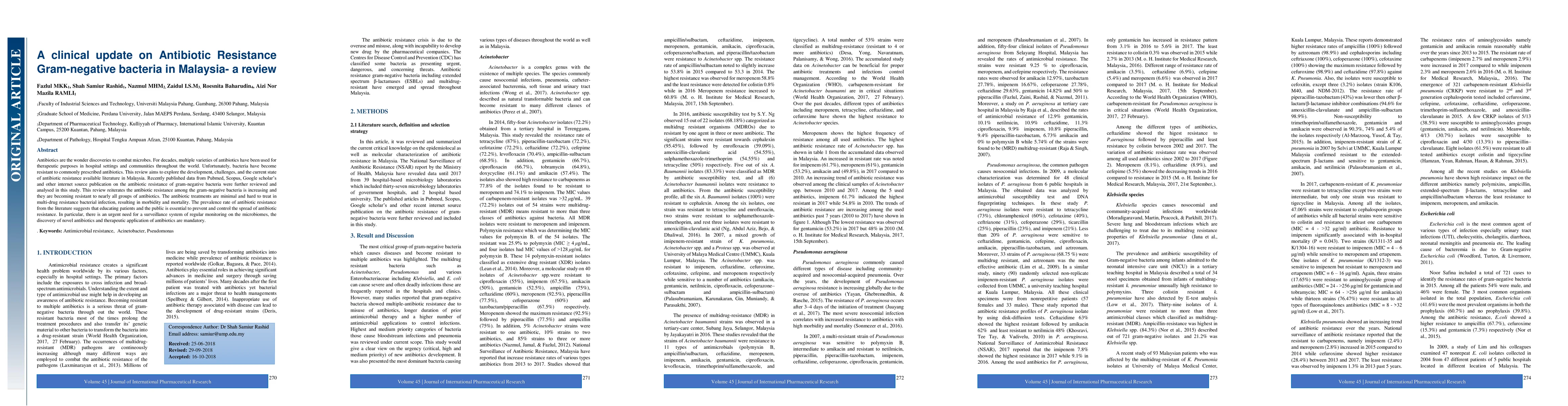 This review examines the escalating antibiotic resistance among Gram-negative bacteria in Malaysia, highlighting the challenges and limited treatment options for multi-drug resistant infections. It emphasizes the need for public education, surveillance, and the development of new antibiotics to combat the issue.