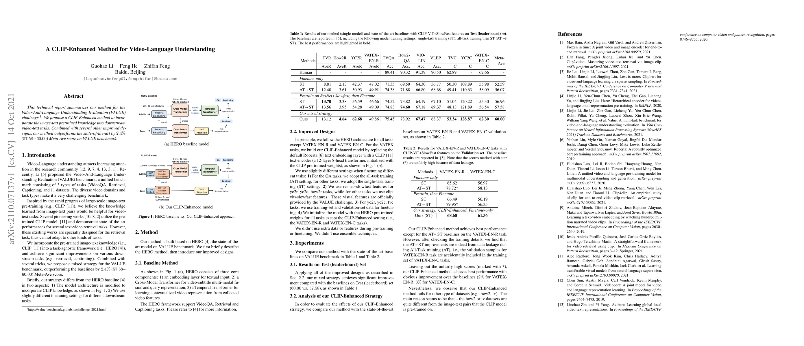 This paper proposes a CLIP-Enhanced method for video-language understanding, outperforming state-of-the-art methods by 2.4% on the Video-And-Language Understanding Evaluation challenge.