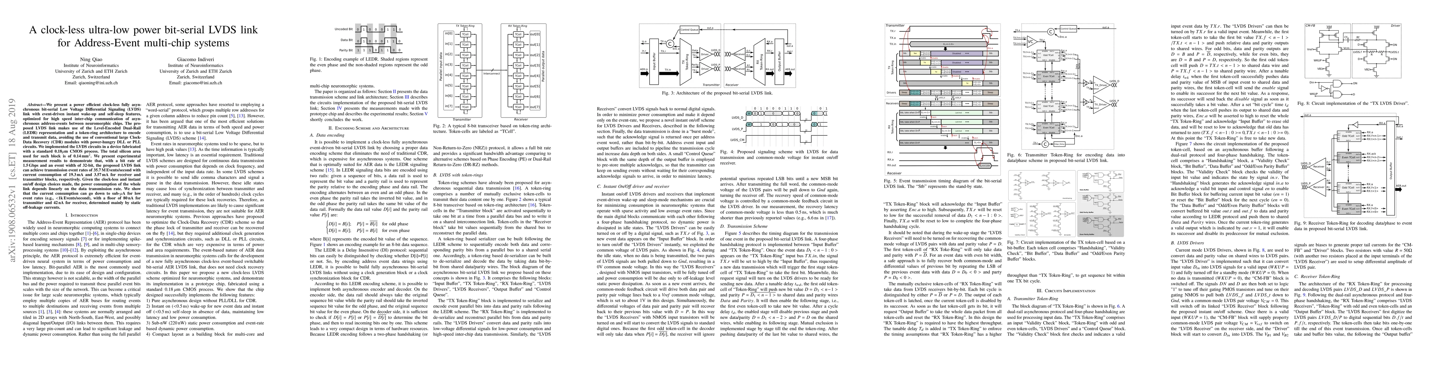 This paper introduces a clock-less, ultra-low power bit-serial LVDS link for asynchronous address-event communication between neuromorphic chips, utilizing LEDR and a token-ring architecture to avoid power-hungry clock recovery modules. The design achieves 1.5 Gbps bit rate with minimal power consumption, scaling linearly with data transmission rate, and can operate down to sub-uA current for low event rates.