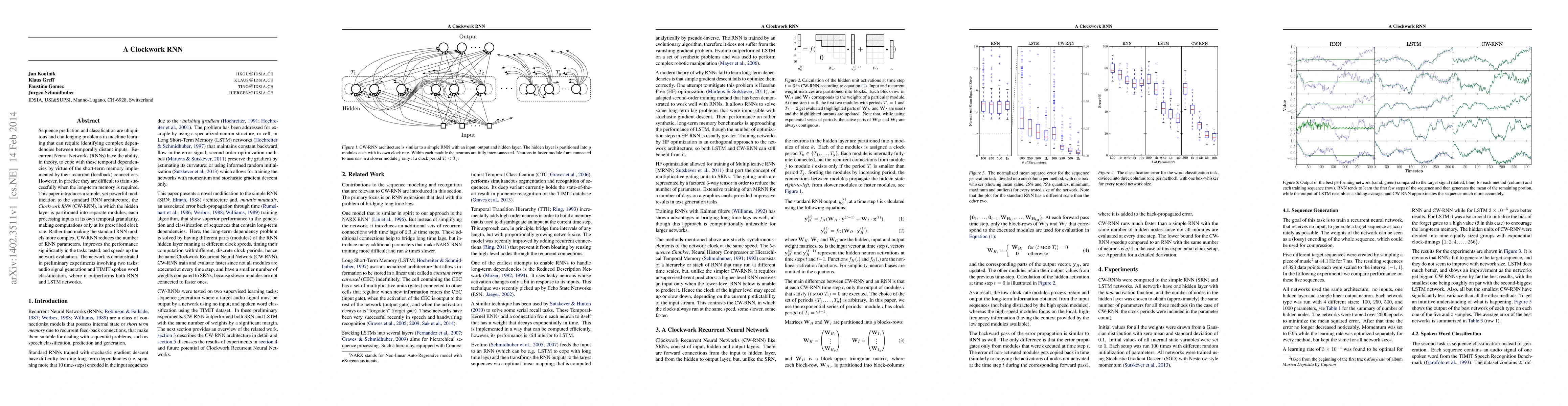 The Clockwork RNN (CW-RNN) modifies standard RNN architecture by partitioning the hidden layer into modules that operate at different temporal granularities, improving performance and reducing parameters. Preliminary experiments show it outperforms RNN and LSTM networks in audio signal generation and spoken word classification.