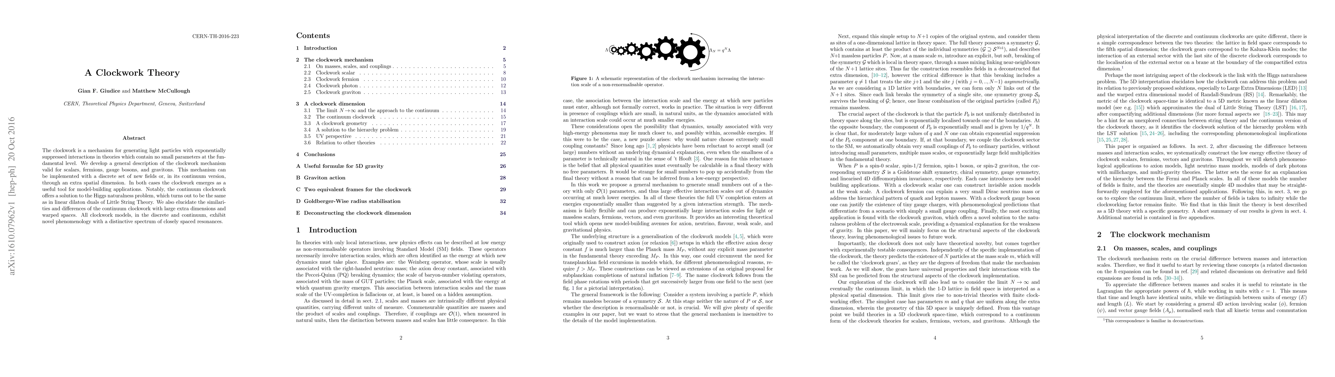 The paper presents a clockwork mechanism for generating light particles with suppressed interactions in theories without fundamental small parameters, applicable to various particles and realizable via new fields or an extra spatial dimension. The continuum version solves the Higgs naturalness issue akin to Little String Theory duals, while showing unique phenomenology featuring closely spaced resonances.