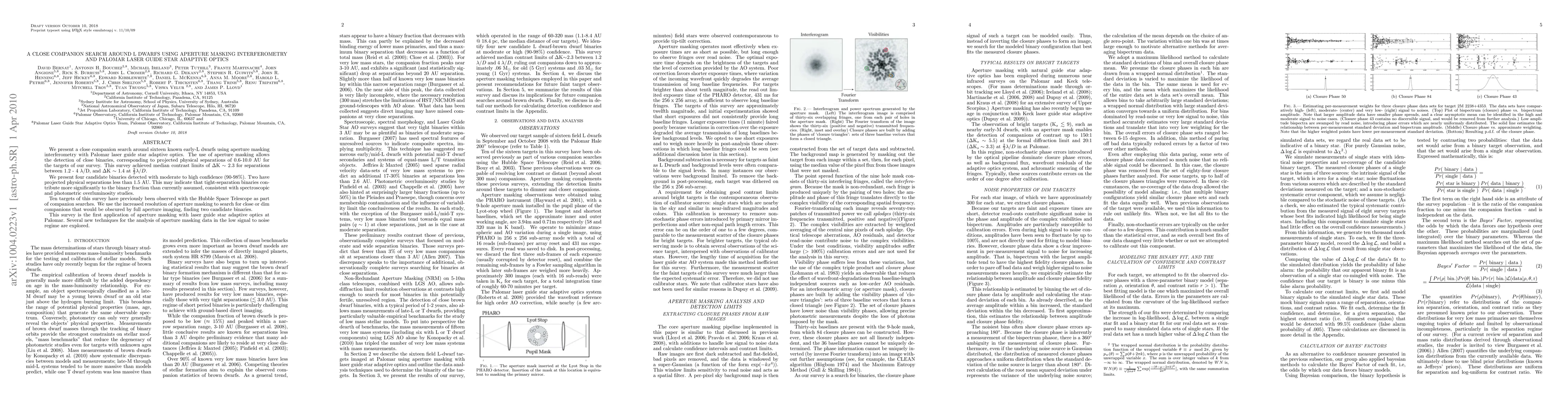 We present a close companion search around sixteen known early-L dwarfs using aperture masking interferometry with Palomar laser guide star adaptive optics. The use of aperture masking allows the detection of close binaries, corresponding to projected physical separations of 0.6-10.0 AU for the targets of our survey. This survey achieved median contrast limits of Delta_K ~ 2.3 for separations between 1.2 - 4 lambda/D, and Delta_K ~ 1.4 at (2/3)lambda/D. We present four candidate binaries detected with moderate to high confidence (90-98%). Two have projected physical separations less than 1.5 AU. This may indicate that tight-separation binaries contribute more significantly to the binary fraction than currently assumed, consistent with spectroscopic and photometric overluminosity studies. Ten targets of this survey have previously been observed with the Hubble Space Telescope as part of companion searches. We use the increased resolution of aperture masking to search for close or dim companions that would be obscured by full aperture imaging, finding two candidate binaries. This survey is the first application of aperture masking with laser guide star adaptive optics at Palomar. Several new techniques for the analysis of aperture masking data in the low signal to noise regime are explored.