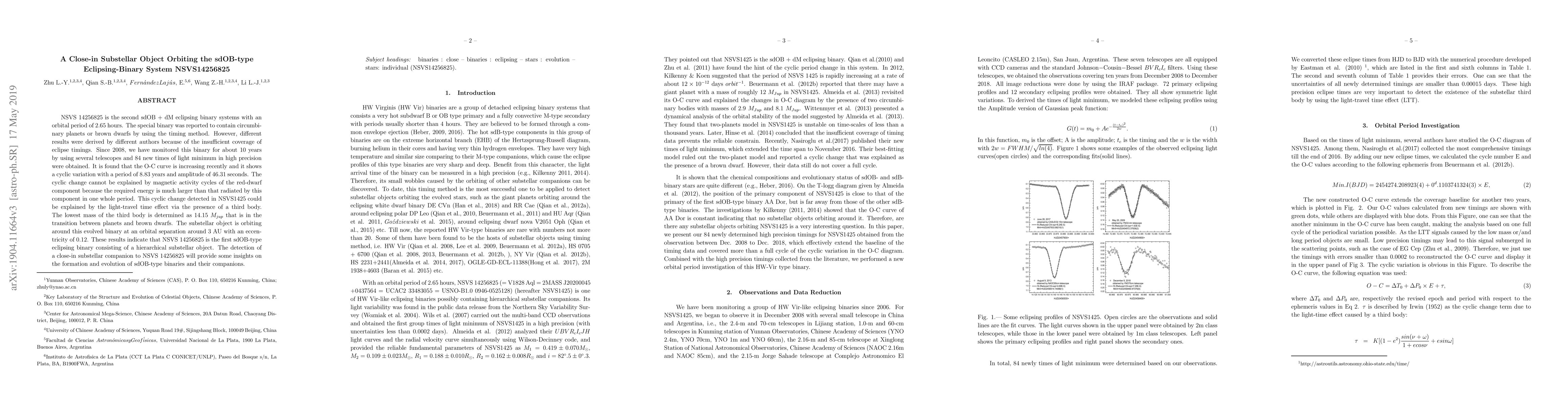 NSVS 14256825 is an sdOB + dM eclipsing binary system with a substellar object detected via light-travel time variations. The substellar object, with a mass of 14.15 $M_{jup}$, orbits the binary at a distance of 3 AU, providing insights into the formation and evolution of such systems.