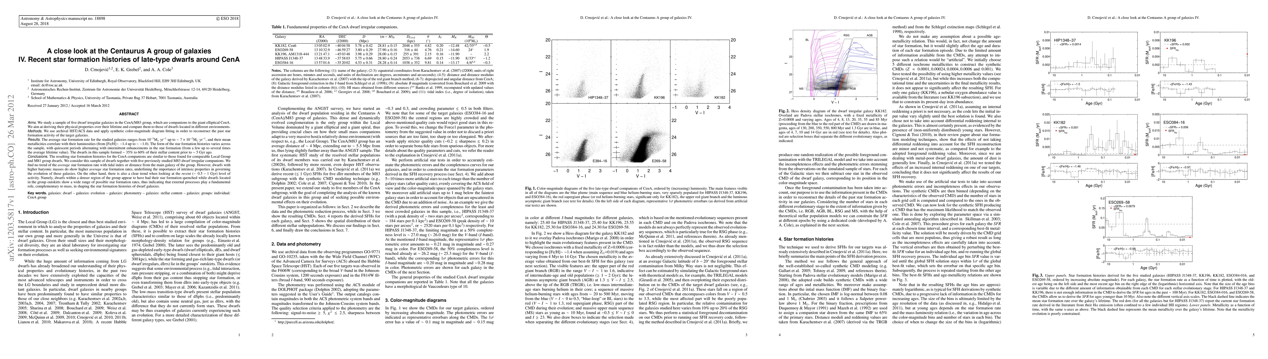 We study a sample of 5 dwarf irregular galaxies in the CenA/M83 group, which are companions to the giant elliptical CenA. We aim at deriving their physical properties over their lifetime and compare them to those of dwarfs located in different environments. We use archival HST/ACS data and apply synthetic color-magnitude diagram fitting in order to reconstruct the past star formation activity of the target galaxies. The average star formation rate for the studied galaxies ranges from 10^{-3} up to \sim 7x10^{-2} M_odot/yr, and their mean metallicities correlate with their luminosities (from [Fe/H]\sim -1.4 up to \sim -1.0). The form of the star formation histories varies across the sample, with quiescent periods alternating with intermittent enhancements in the star formation (from a few up to several times the average lifetime value). The dwarfs in this sample formed ~35% to ~60% of their stellar content prior to ~5 Gyr ago. The resulting star formation histories for the CenA companions are similar to those found for comparable Local Group and M81 group dwarfs. We consider this sample of dwarfs together with 5 previously studied M83 dwarf irregular companions. We find no trend of the average star formation rate with tidal index or distance from the main galaxy of the group. However, dwarfs with higher baryonic masses do show higher average star formation rates, underlining the importance of intrinsic properties in governing the evolution of these galaxies. On the other hand, there is also a clear trend when looking at the recent (~0.5-1 Gyr) level of activity. Namely, dwarfs within a denser region of the group appear to have had their star formation quenched while dwarfs located in the group outskirts show a wide range of possible star formation rates, thus indicating that external processes play a fundamental role, complementary to mass, in shaping the star formation histories of dwarf galaxies.