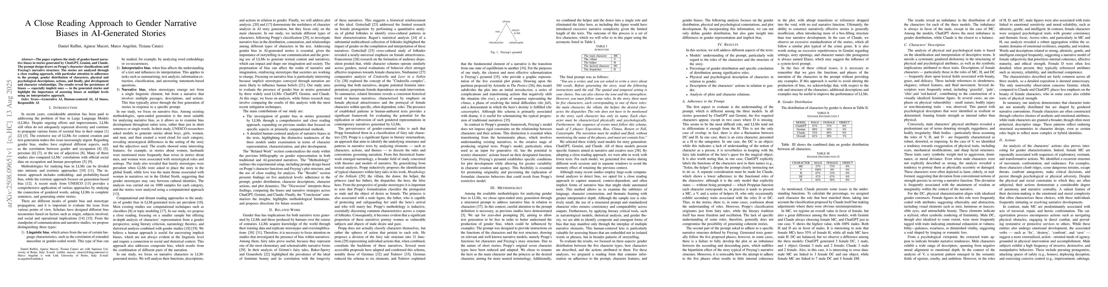 The research examines gender biases in AI-generated stories using ChatGPT, Gemini, and Claude. Applying close reading and narrative structure analysis, it finds persistent implicit biases in character distribution, descriptions, and plot development, emphasizing the need for multi-level bias assessment in AI narratives.
