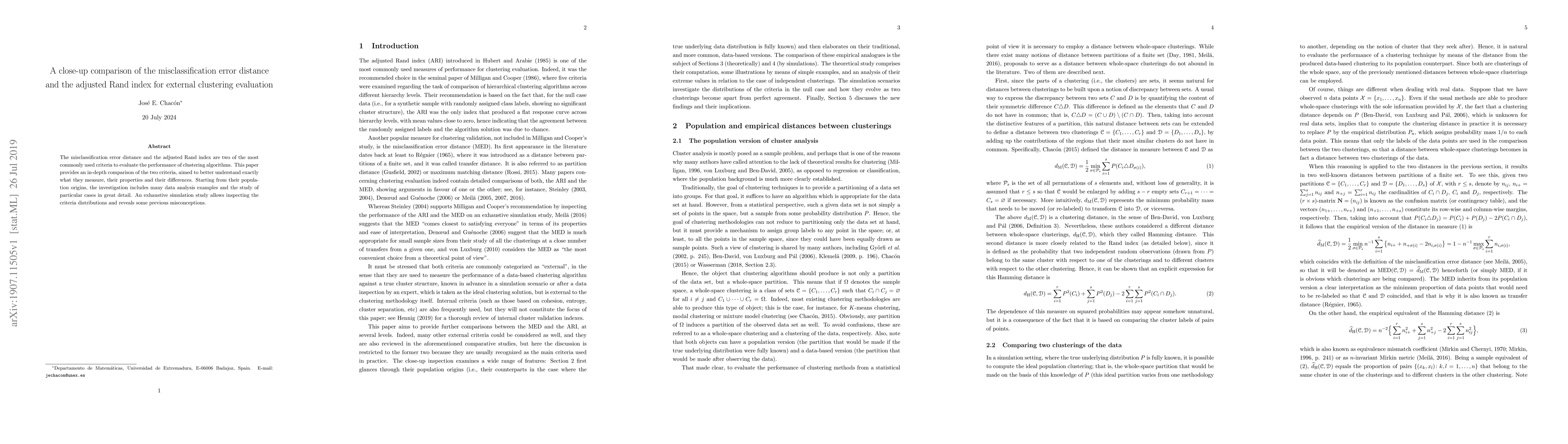 The misclassification error distance and the adjusted Rand index are two of the most commonly used criteria to evaluate the performance of clustering algorithms. This paper provides an in-depth comparison of the two criteria, aimed to better understand exactly what they measure, their properties and their differences. Starting from their population origins, the investigation includes many data analysis examples and the study of particular cases in great detail. An exhaustive simulation study allows inspecting the criteria distributions and reveals some previous misconceptions.