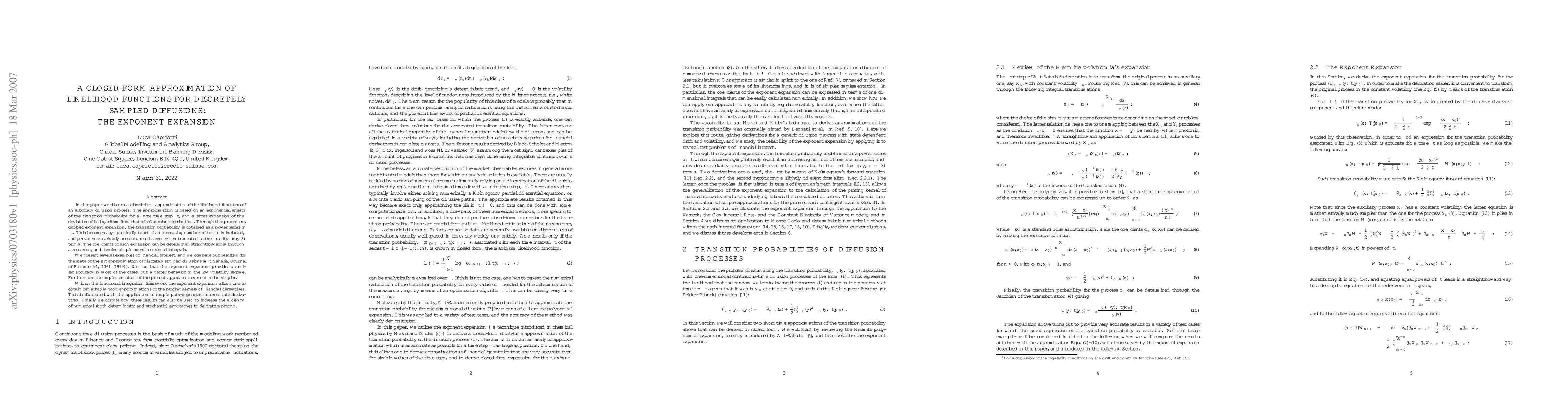 In this paper we discuss a closed-form approximation of the likelihood functions of an arbitrary diffusion process. The approximation is based on an exponential ansatz of the transition probability for a finite time step $\Delta t$, and a series expansion of the deviation of its logarithm from that of a Gaussian distribution. Through this procedure, dubbed {\em exponent expansion}, the transition probability is obtained as a power series in $\Delta t$. This becomes asymptotically exact if an increasing number of terms is included, and provides remarkably accurate results even when truncated to the first few (say 3) terms. The coefficients of such expansion can be determined straightforwardly through a recursion, and involve simple one-dimensional integrals. We present several examples of financial interest, and we compare our results with the state-of-the-art approximation of discretely sampled diffusions [A\"it-Sahalia, {\it Journal of Finance} {\bf 54}, 1361 (1999)]. We find that the exponent expansion provides a similar accuracy in most of the cases, but a better behavior in the low-volatility regime. Furthermore the implementation of the present approach turns out to be simpler. Within the functional integration framework the exponent expansion allows one to obtain remarkably good approximations of the pricing kernels of financial derivatives. This is illustrated with the application to simple path-dependent interest rate derivatives. Finally we discuss how these results can also be used to increase the efficiency of numerical (both deterministic and stochastic) approaches to derivative pricing.
