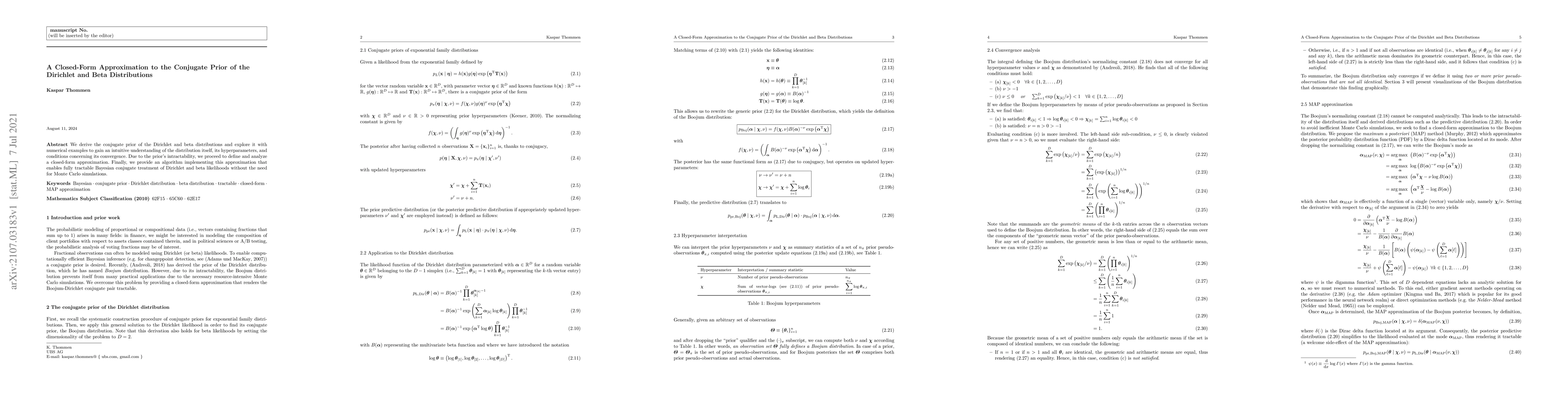 We derive the conjugate prior of the Dirichlet and beta distributions and explore it with numerical examples to gain an intuitive understanding of the distribution itself, its hyperparameters, and conditions concerning its convergence. Due to the prior's intractability, we proceed to define and analyze a closed-form approximation. Finally, we provide an algorithm implementing this approximation that enables fully tractable Bayesian conjugate treatment of Dirichlet and beta likelihoods without the need for Monte Carlo simulations.