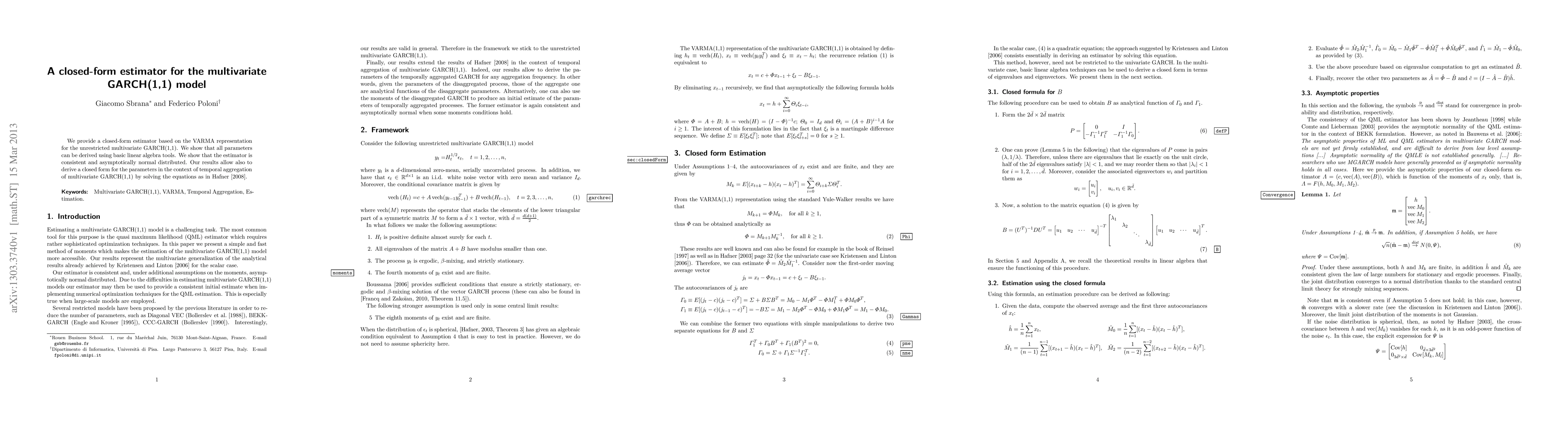 We provide a closed-form estimator based on the VARMA representation for the unrestricted multivariate GARCH(1,1). We show that all parameters can be derived using basic linear algebra tools. We show that the estimator is consistent and asymptotically normal distributed. Our results allow also to derive a closed form for the parameters in the context of temporal aggregation of multivariate GARCH(1,1) by solving the equations as in Hafner [2008].