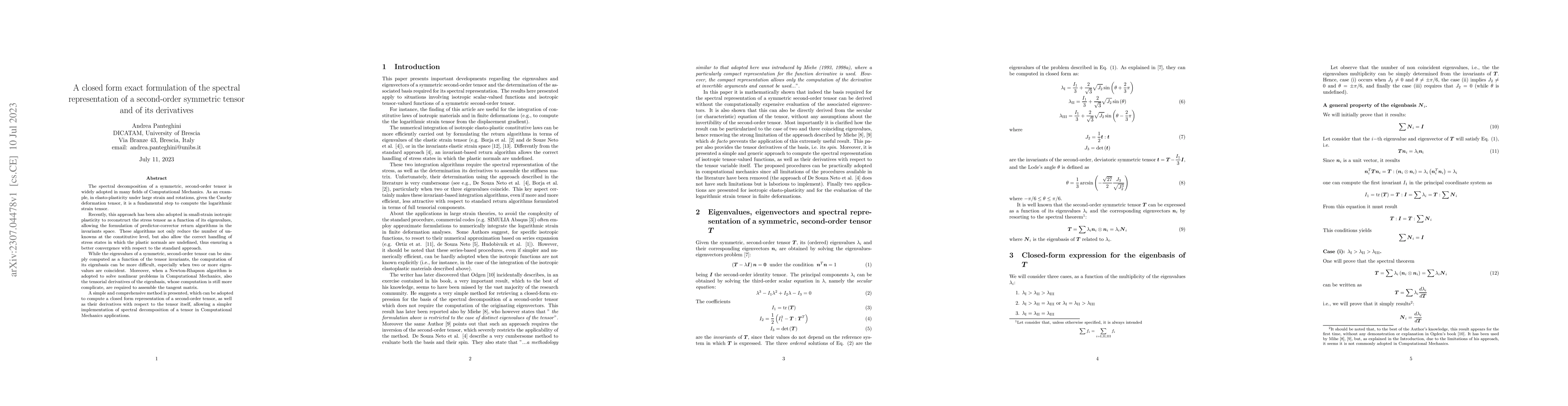 This paper presents a closed form exact formulation for the spectral representation of a symmetric second-order tensor and its derivatives, facilitating the implementation of spectral decomposition in computational mechanics, particularly in elasto-plasticity and small-strain isotropic plasticity. The method simplifies the computation of eigenbasis and tensorial derivatives, enhancing convergence and handling of undefined plastic normals.