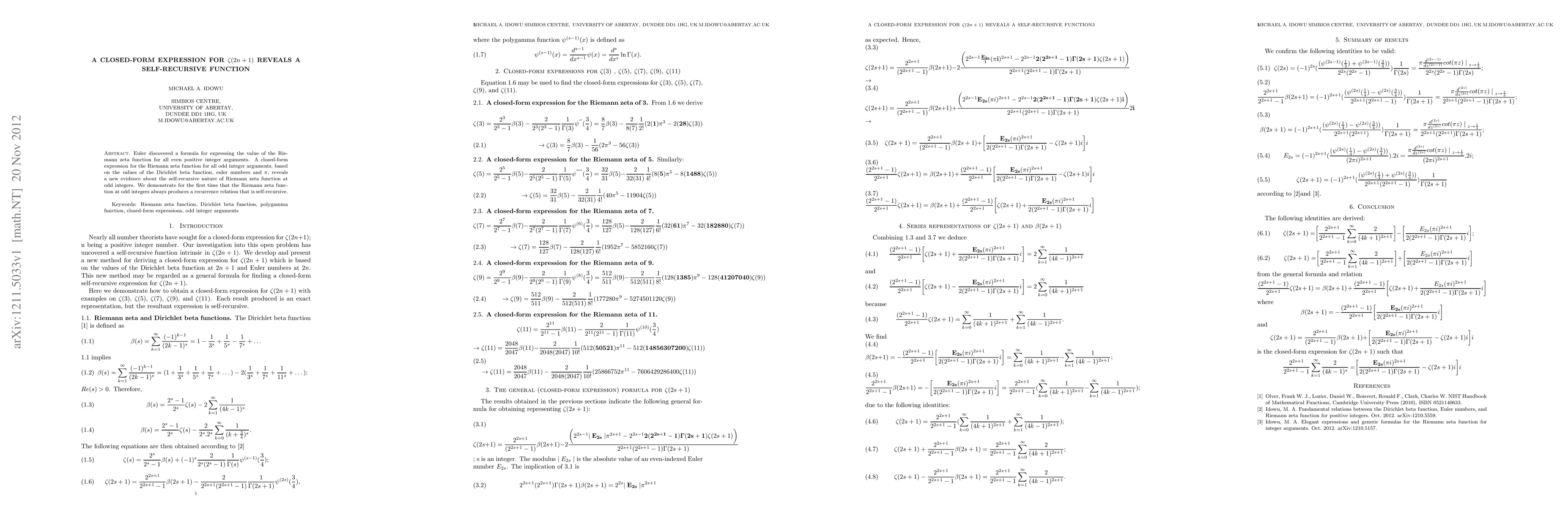 This paper presents a closed-form expression for the Riemann zeta function at odd integer arguments, revealing a self-recursive nature. The expression connects values of the Dirichlet beta function, euler numbers, and pi, demonstrating a new recurrence relation for zeta(2n+1).
