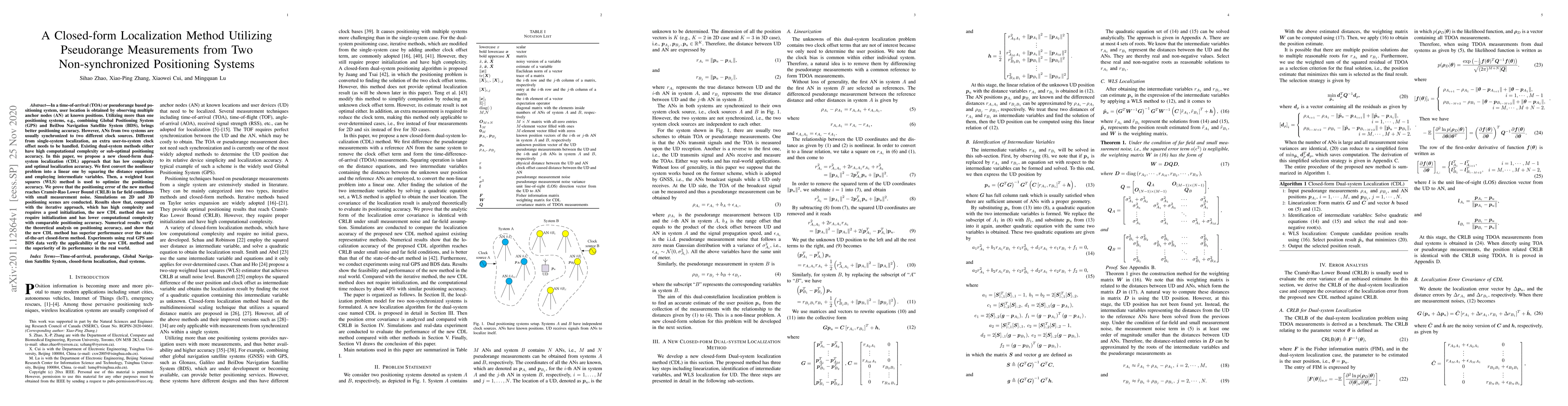 This paper proposes a new closed-form dual-system localization (CDL) method for combining GPS and BDS measurements, addressing the challenge of non-synchronized clocks. The method converts the nonlinear localization problem into a linear one, optimizing accuracy via weighted least squares, and achieves optimal performance with low computational complexity.