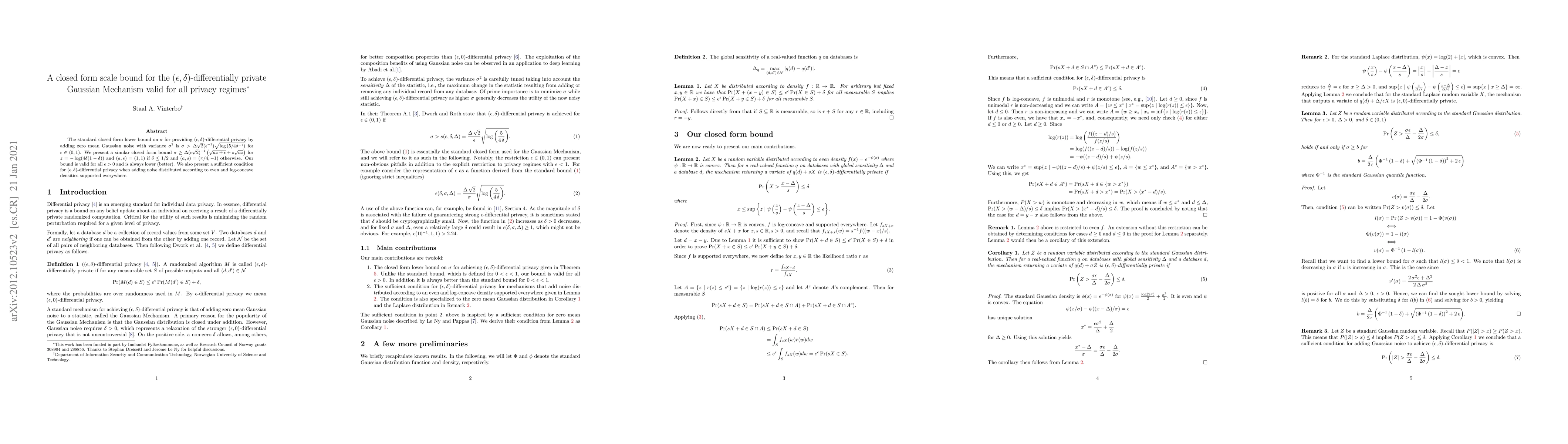 The standard closed form lower bound on $\sigma$ for providing $(\epsilon, \delta)$-differential privacy by adding zero mean Gaussian noise with variance $\sigma^2$ is $\sigma > \Delta\sqrt {2}(\epsilon^{-1}) \sqrt {\log \left( 5/4\delta^{-1} \right)}$ for $\epsilon \in (0,1)$. We present a similar closed form bound $\sigma \geq \Delta (\epsilon\sqrt{2})^{-1} \left(\sqrt{az+\epsilon} + s\sqrt{az}\right)$ for $z=-\log(4\delta(1-\delta))$ and $(a,s)=(1,1)$ if $\delta \leq 1/2$ and $(a,s)=(\pi/4,-1)$ otherwise. Our bound is valid for all $\epsilon > 0$ and is always lower (better). We also present a sufficient condition for $(\epsilon, \delta)$-differential privacy when adding noise distributed according to even and log-concave densities supported everywhere.