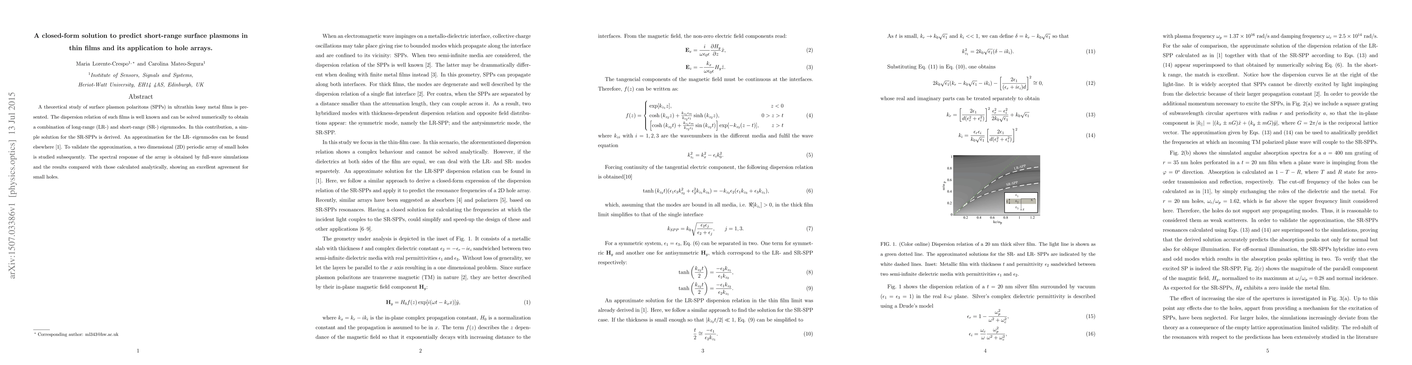 A theoretical study of surface plasmon polaritons (SPPs) in ultrathin lossy metal films is presented. The dispersion relation of such films is well known and can be solved numerically to obtain a combination of long-range (LR-) and short-range (SR-) eigenmodes. In this contribution, a simple solution for the SR-SPPs is derived. An approximation for the LR- eigenmodes can be found elsewhere. To validate the approximation, a two dimensional (2D) periodic array of small holes is studied subsequently. The spectral response of the array is obtained by full-wave simulations and the results compared with those calculated analytically, showing an excellent agreement for small holes.