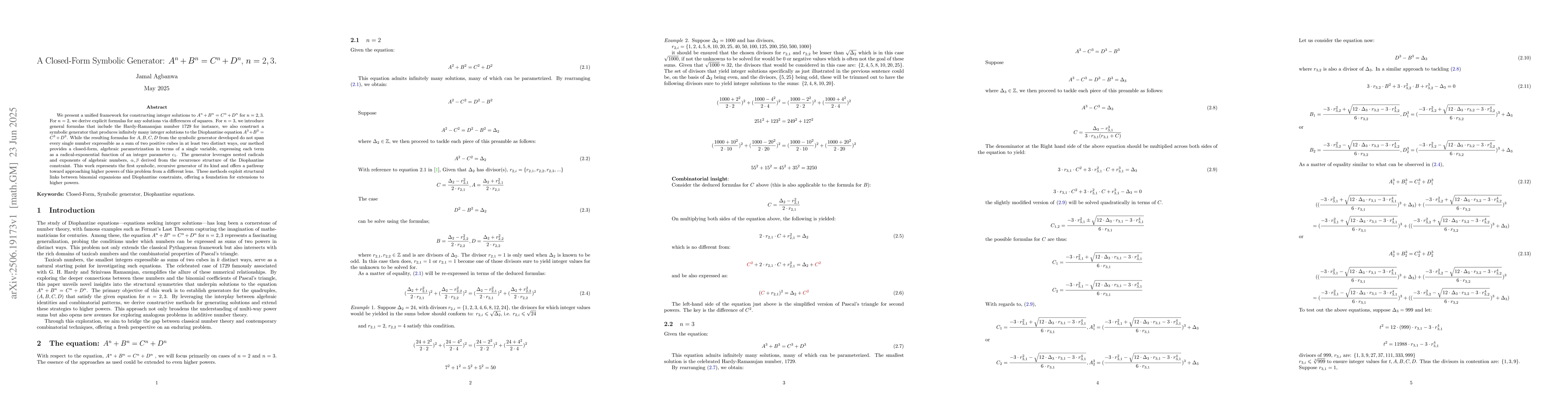 We present a unified framework for constructing integer solutions to $A^{n} + B^{n} = C^{n} + D^{n}$ for $n=2,3$. For $n=2$, we derive explicit formulas for any solutions via differences of squares. For $n=3$, we introduce general formulas that include the Hardy-Ramanujan number 1729 for instance, we also construct a symbolic generator that produces infinitely many integer solutions to the Diophantine equation A^3 + B^3 = C^3 + D^3 . While the resulting formulas for $A,B,C,D$ from the symbolic generator developed do not span every single number expressible as a sum of two positive cubes in at least two distinct ways, our method provides a closed-form, algebraic parametrization in terms of a single variable, expressing each term as a radical-exponential function of an integer parameter $c_1$. The generator leverages nested radicals and exponents of algebraic numbers, $\alpha, \beta$ derived from the recurrence structure of the Diophantine constraint. This work represents the first symbolic, recursive generator of its kind and offers a pathway toward approaching higher powers of this problem from a different lens. These methods exploit structural links between binomial expansions and Diophantine constraints, offering a foundation for extensions to higher powers.